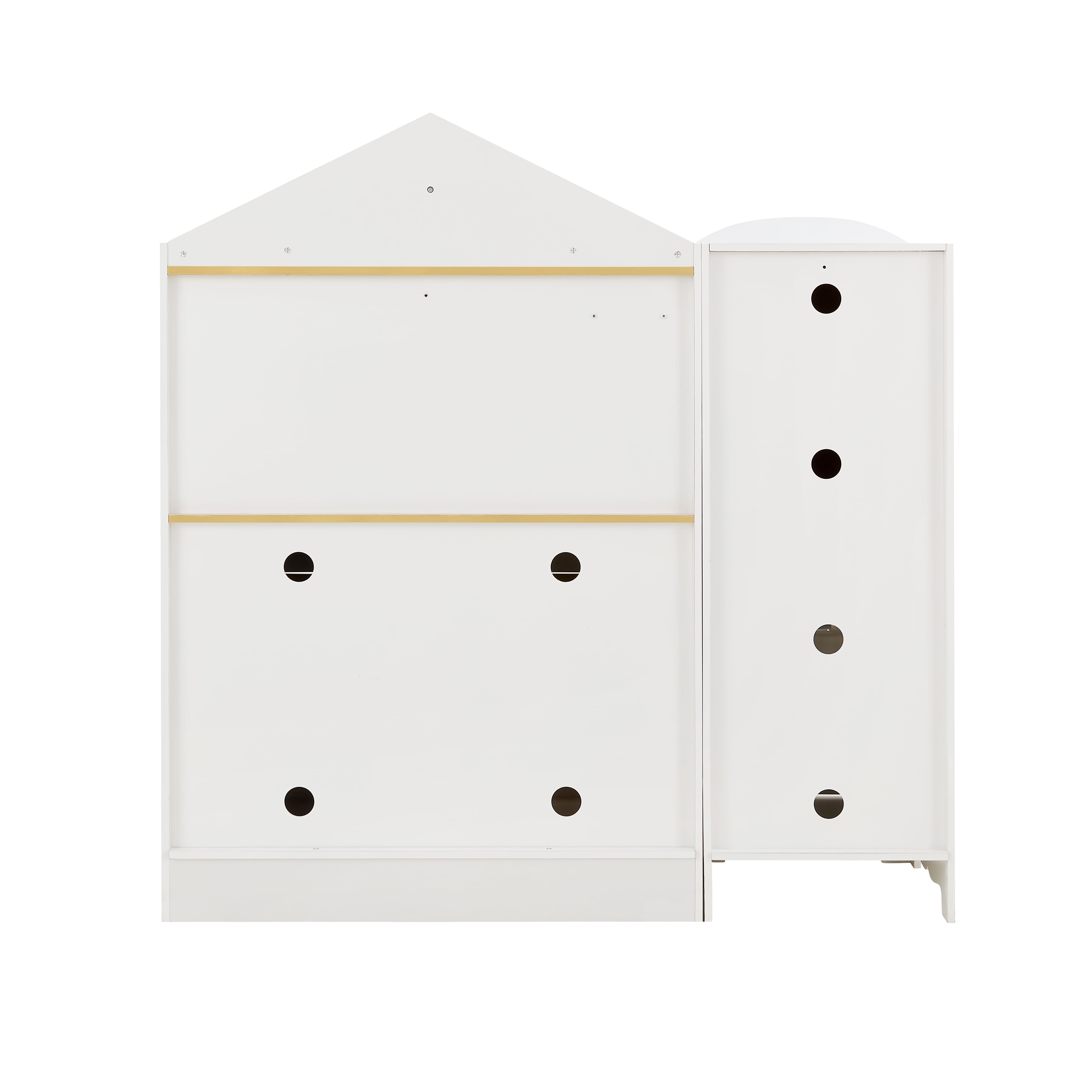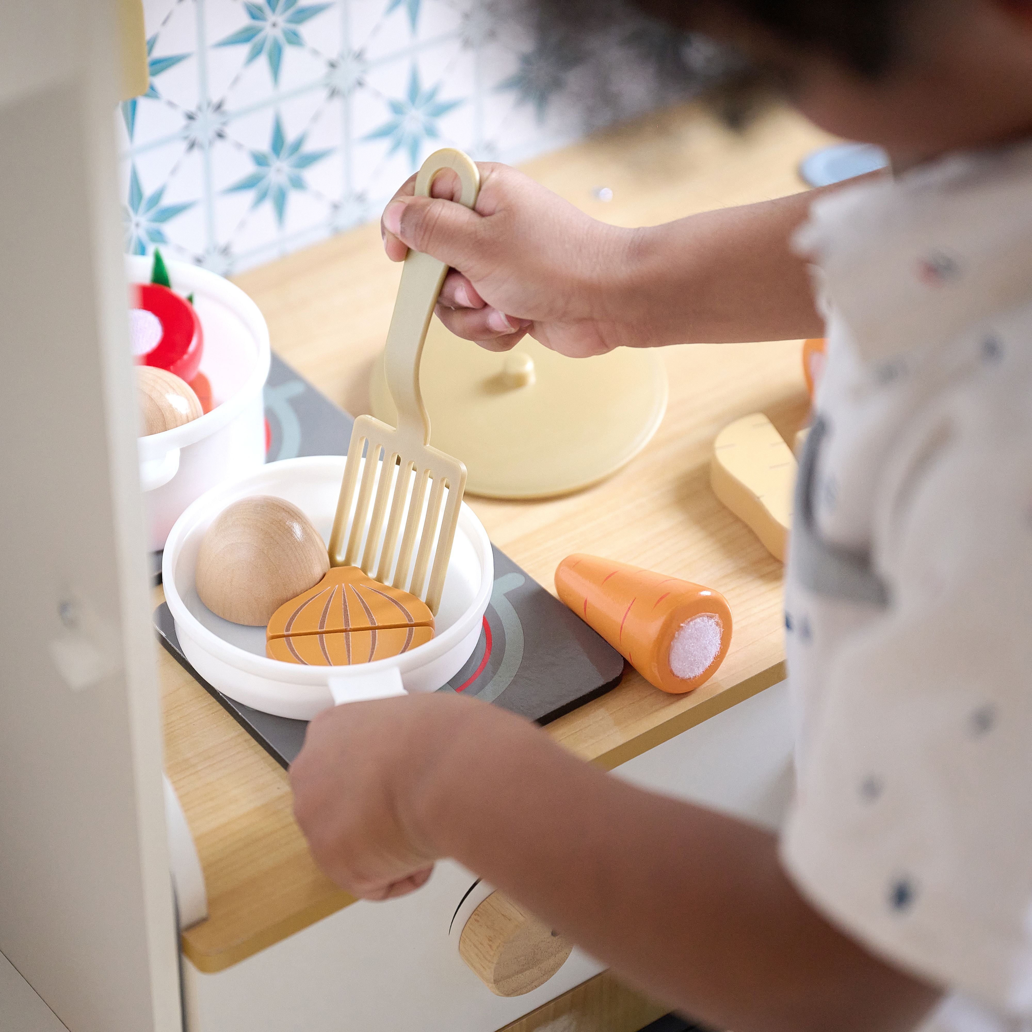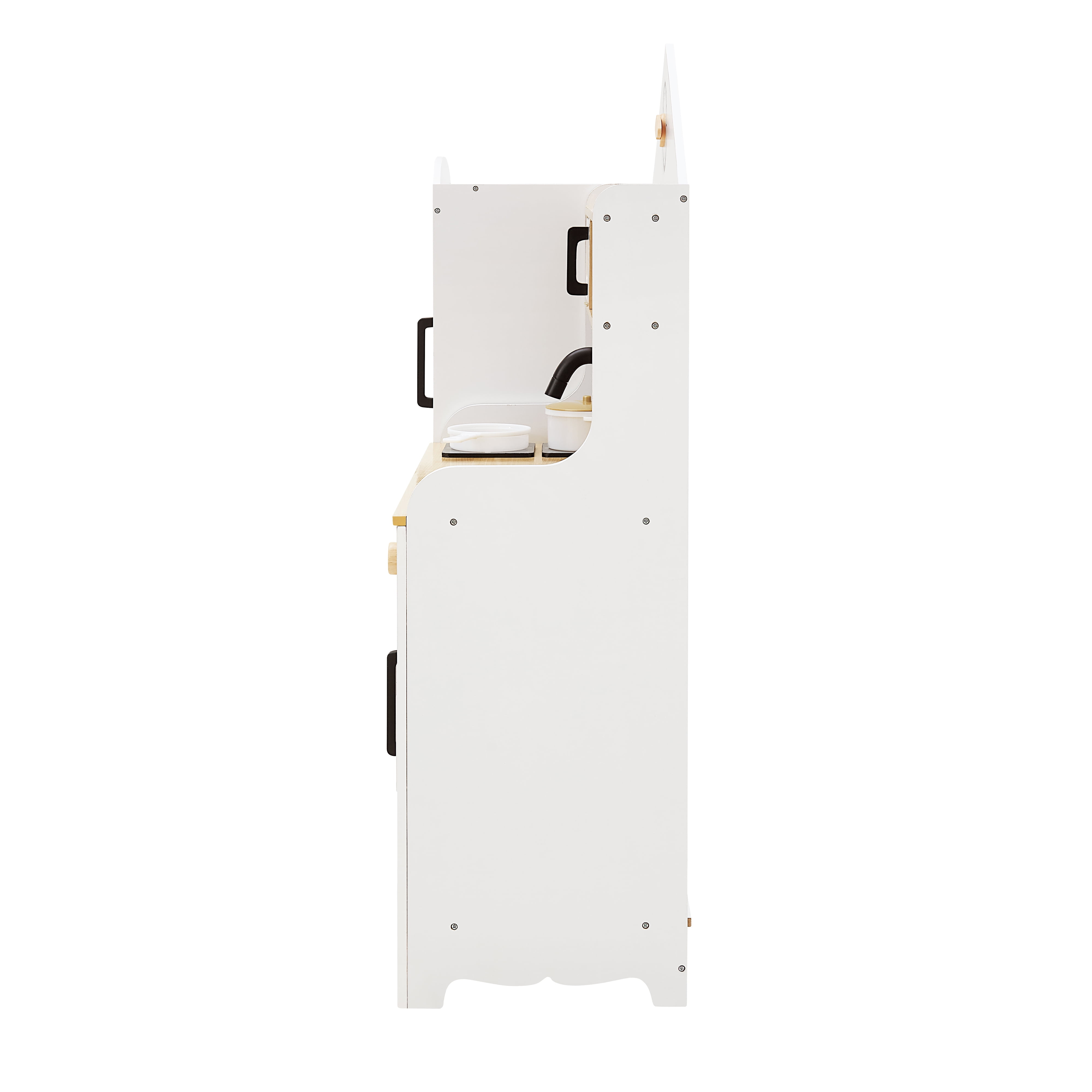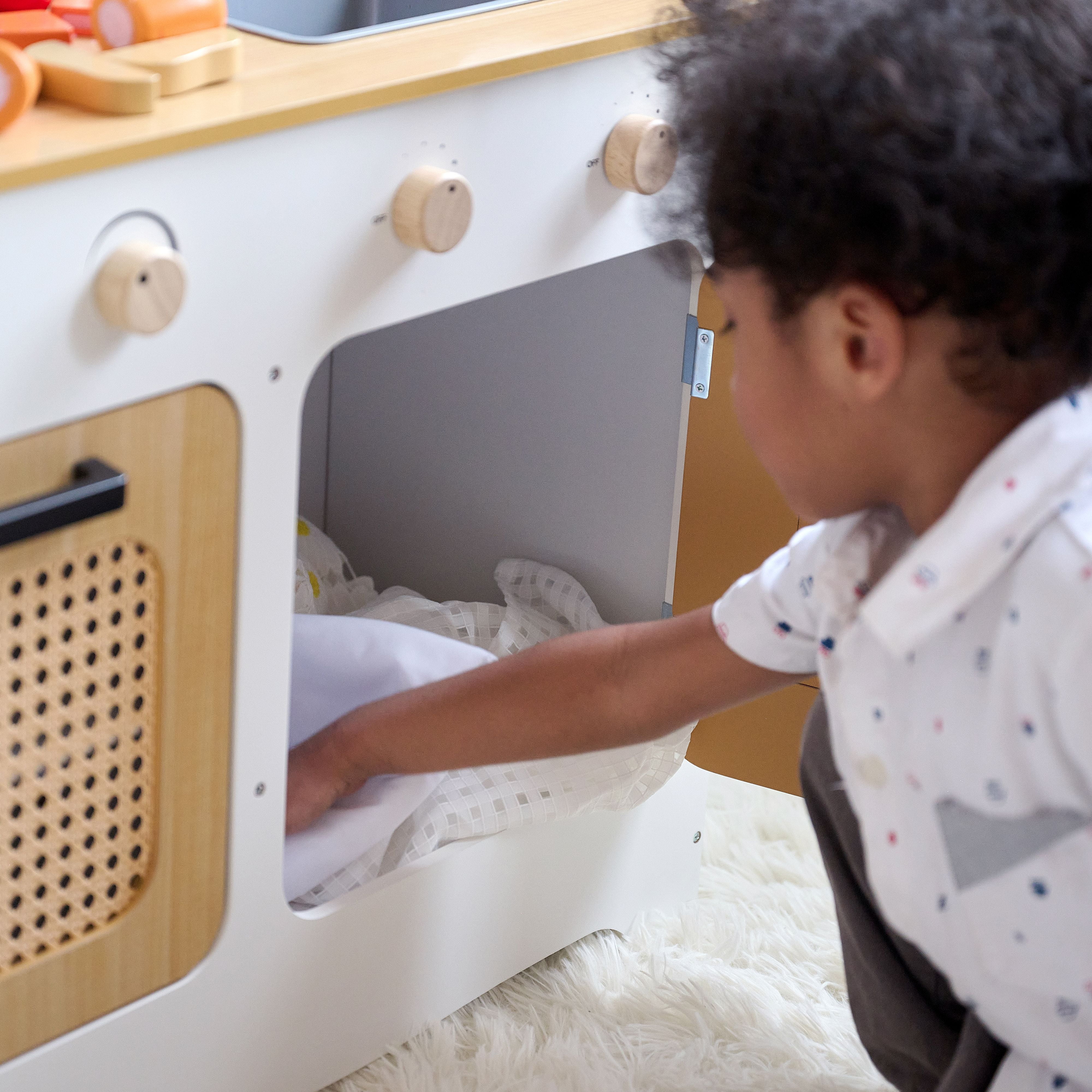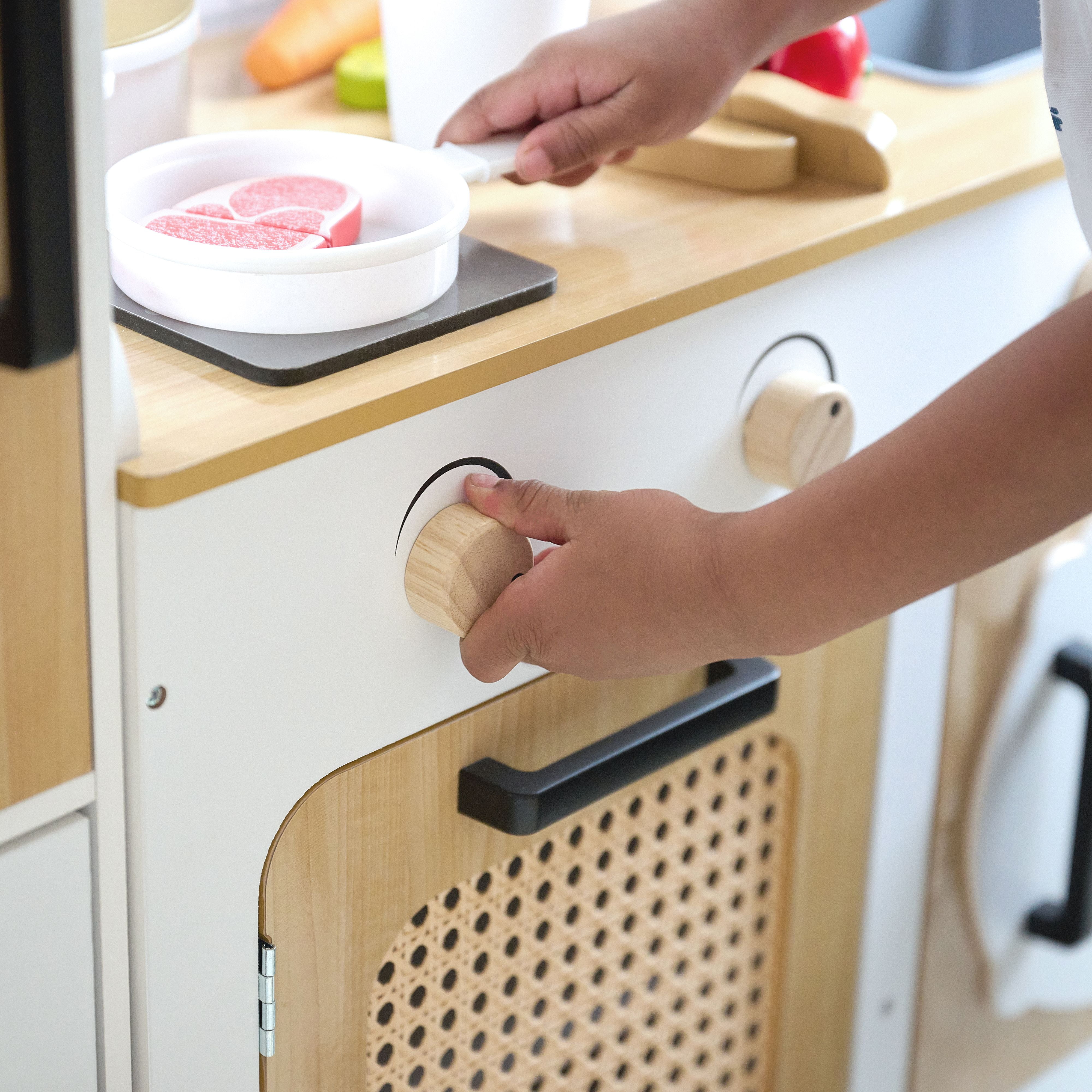 Complete Modular Play Kitchen: Includes separate refrigerator and combo unit with oven, microwave, washer, and sink—perfect kids kitchen playset for realistic pretend routines at home. Interactive Toy Kitchen for Toddlers: Features clicking knobs, movable faucet, ice dispenser, and chalkboard for hands-on sensory play that encourages independence and life-skill growth. Stylish & Compact Kids Kitchen: Faux Moroccan tile, rattan-textured doors, and wood finishes elevate this wooden kitchen for toddlers without overwhelming small spaces. Complete 11-Piece Accessory Set: Includes pot, pan, lid, spatulas, salt & pepper shakers, cup, and pretend ice cubes—everything needed for creative toddler kitchen roleplay. Safe, Compact & Durable Design: Made from wood. Dimensions—Fridge: 12.25″ L x 11.5″ W x 34.5″ H; Main Body: 26.3″ L x 11.5″ W x 39.4″ H. Meets safety standards. DIMENSIONS: Refrigerator (12.25″ L x 11.5″ W x 34.5″ H); Oven/Sink (26.3″ L x 11.5″ W x 39.4″ H) ASSEMBLY REQUIRED: Phillips Screwdriver Recommended (