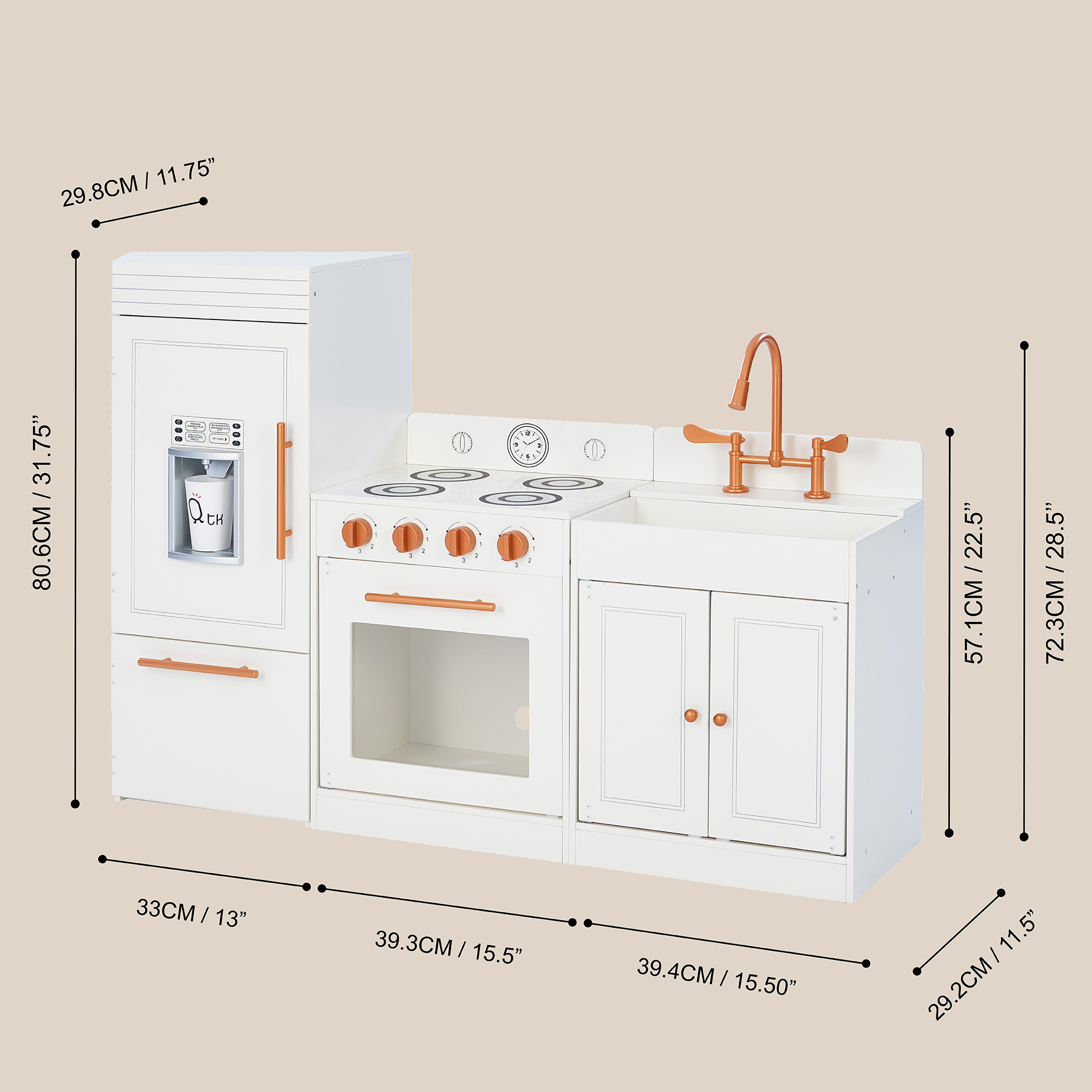 CONTEMPORARY-STYLED PLAY KITCHEN: Sleek white finish with rose gold fixtures with detailed illustrations MODULAR FOR FLEXIBLE ARRANGEMENT IN PLAY SPACES: A deep, Farmhouse-style sink, an oven with a large viewing window, and a refrigerator with an icemaker REALISTIC INTERACTIVE FEATURES: Faucet handles turn, oven knobs twist and make clicking noises, and the refrigerator’s ice maker can dispense three pretend ice cubes AMPLE STORAGE AVAILABLE: Plenty of space in the oven, under the sink and inside the refrigerator – no more lost toys and cleaning up is easier DIMENSIONS (as a combined unit): 44″ L x 11.75″ W x 31.75″ H, 44.74 lbs. Recommended Age Group: Child