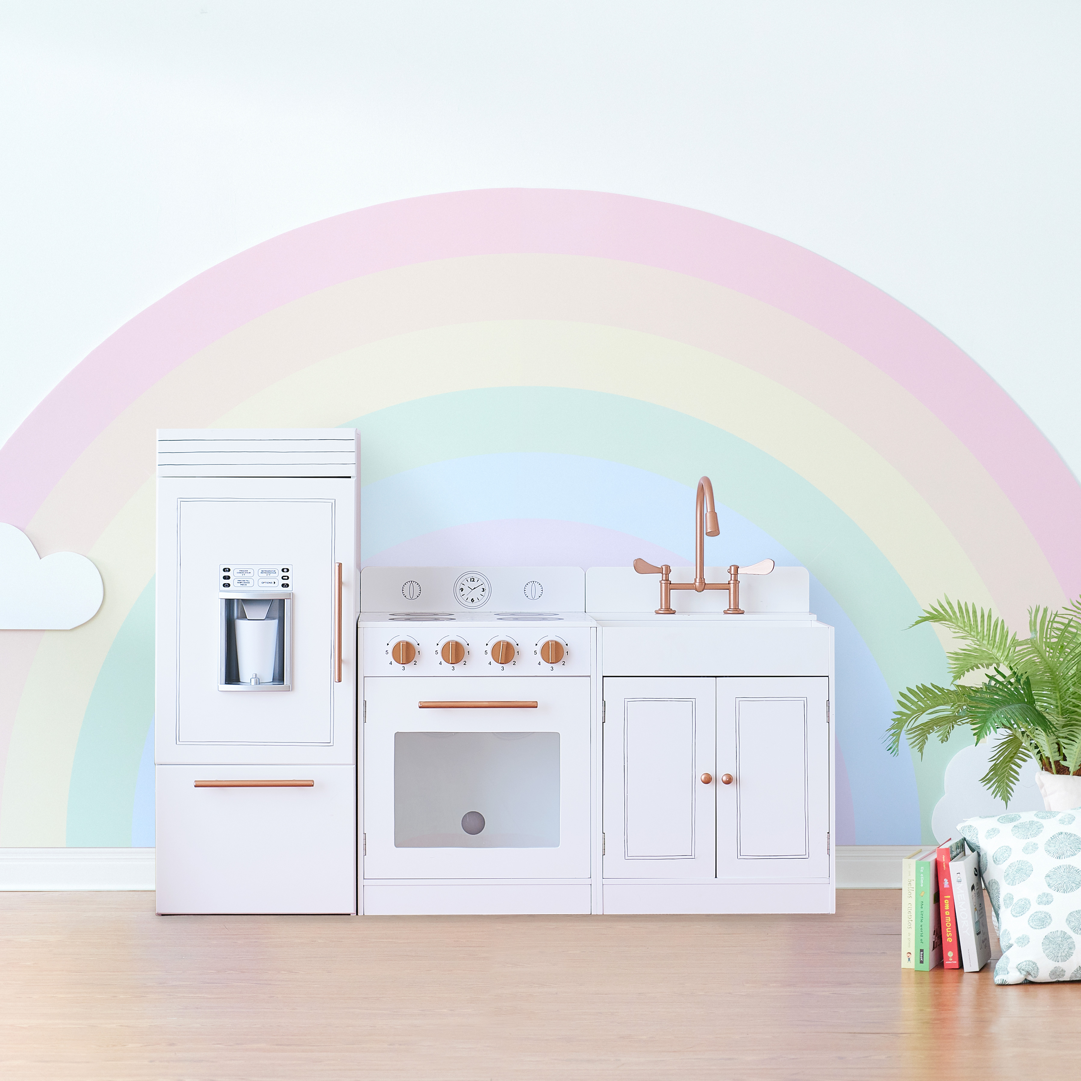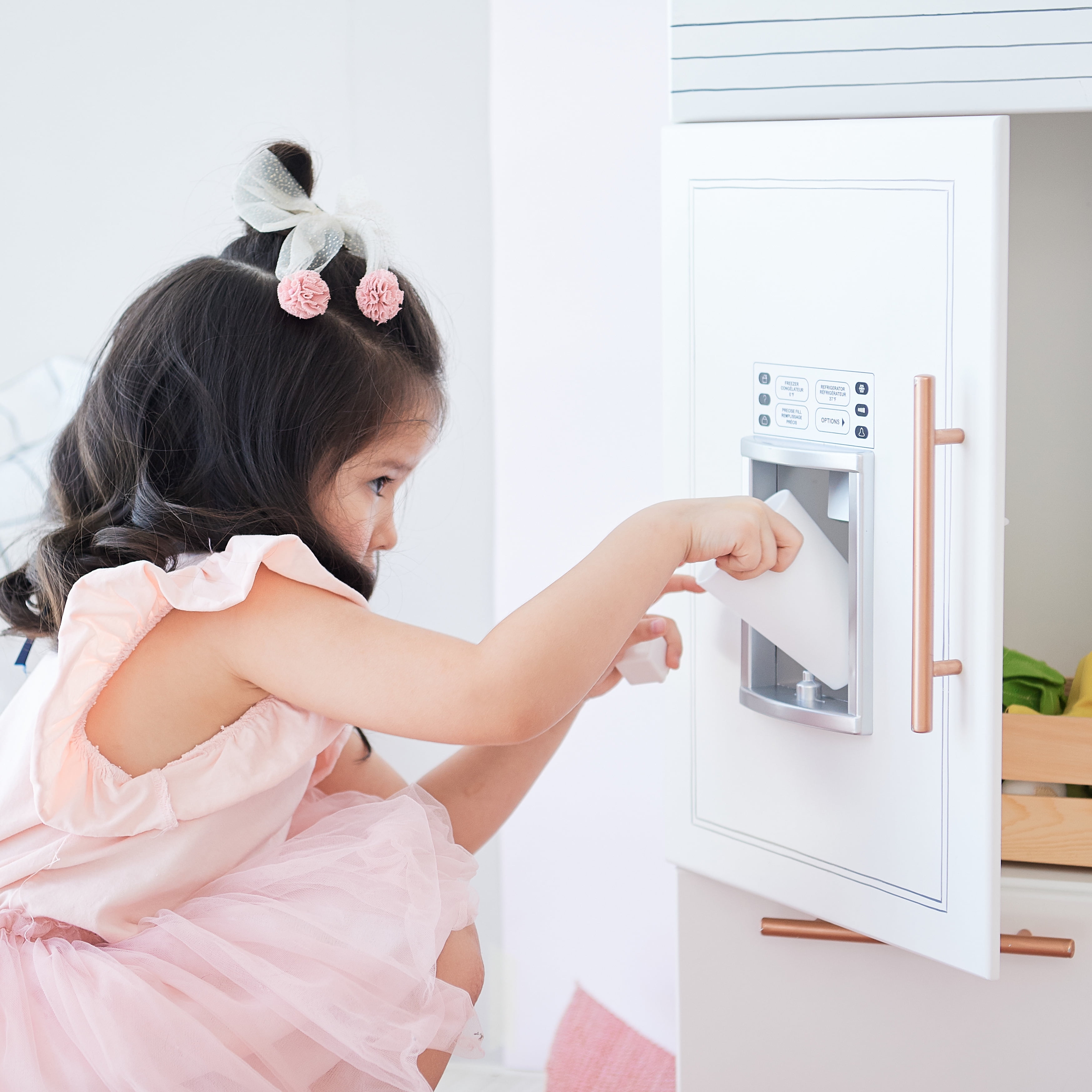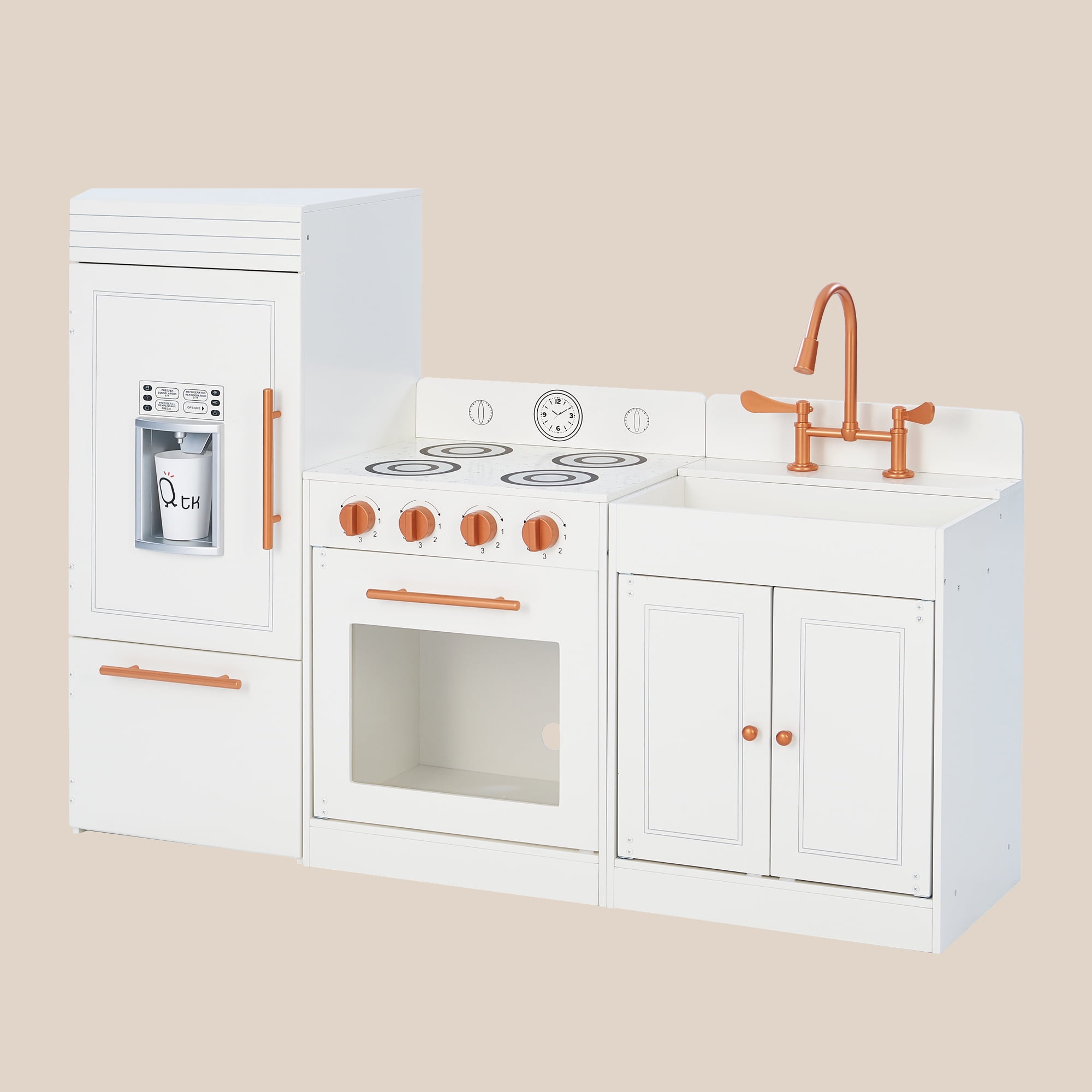 The Little Chef Paris Modular Wooden Play Kitchen comes in three units in a sleek white finish with rose gold hardware. The refrigerator features a working ice dispenser, the oven has turning knobs that click, and the deep farmhouse-style sink features a vintage-style faucet with handles that turn. The interactive features and attention to detail help spark a child’s imagination. Teamson Kids play kitchens feature ample storage space so play food and dishes aren’t lost and clean-up is easy.