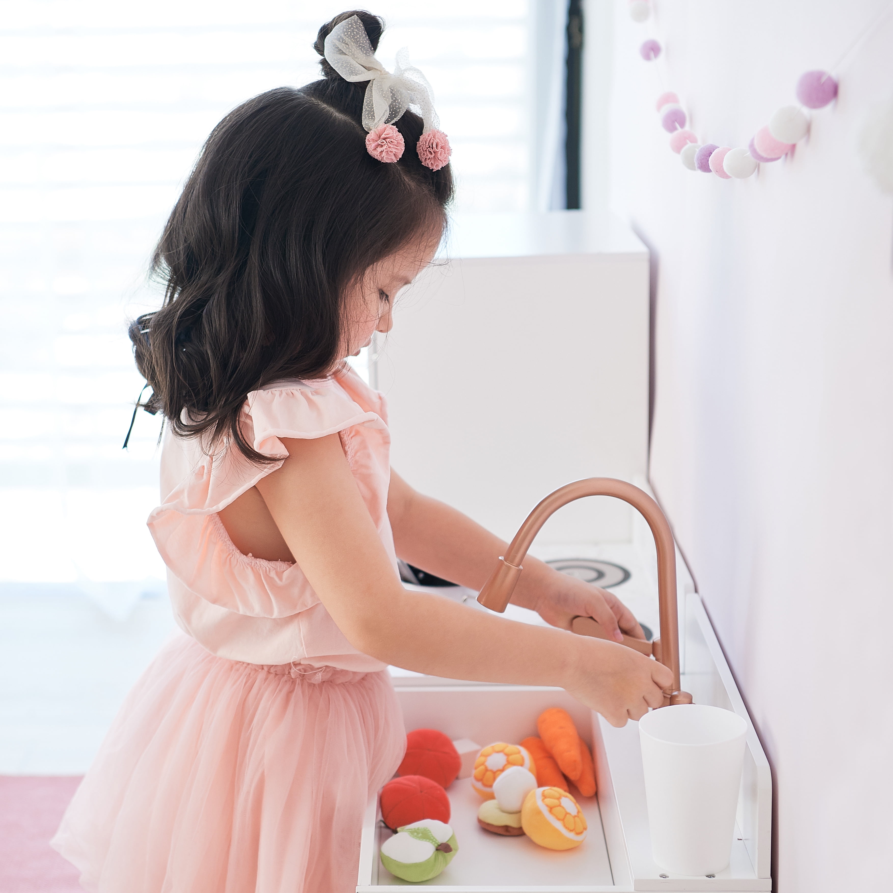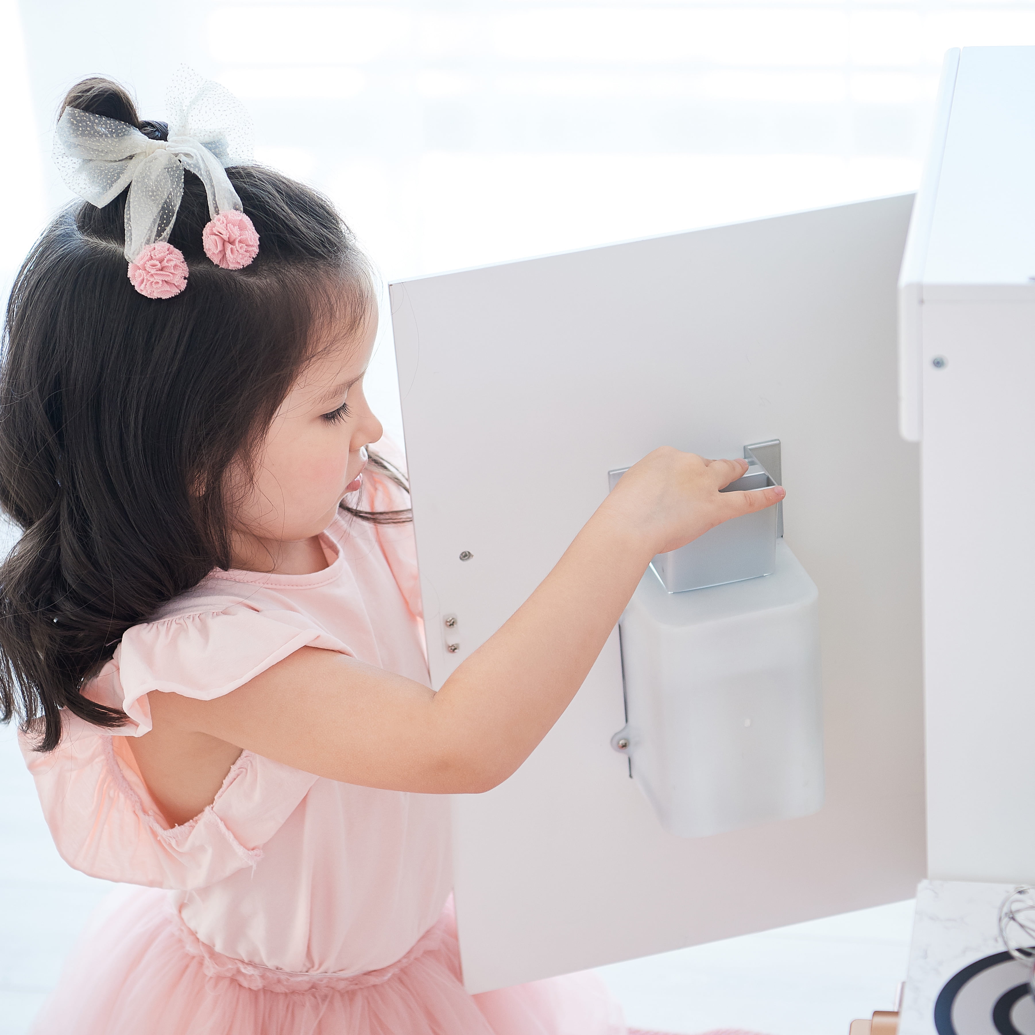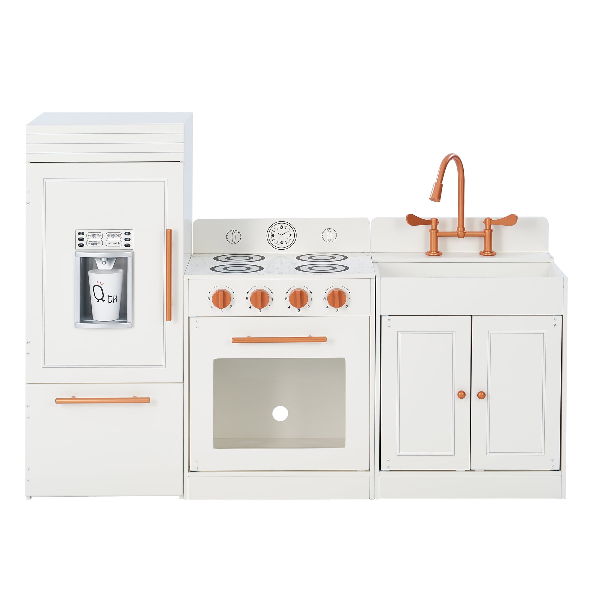 The Little Chef Paris Modular Wooden Play Kitchen comes in three units in a sleek white finish with rose gold hardware. The refrigerator features a working ice dispenser, the oven has turning knobs that click, and the deep farmhouse-style sink features a vintage-style faucet with handles that turn. The interactive features and attention to detail help spark a child’s imagination. Teamson Kids play kitchens feature ample storage space so play food and dishes aren’t lost and clean-up is easy.