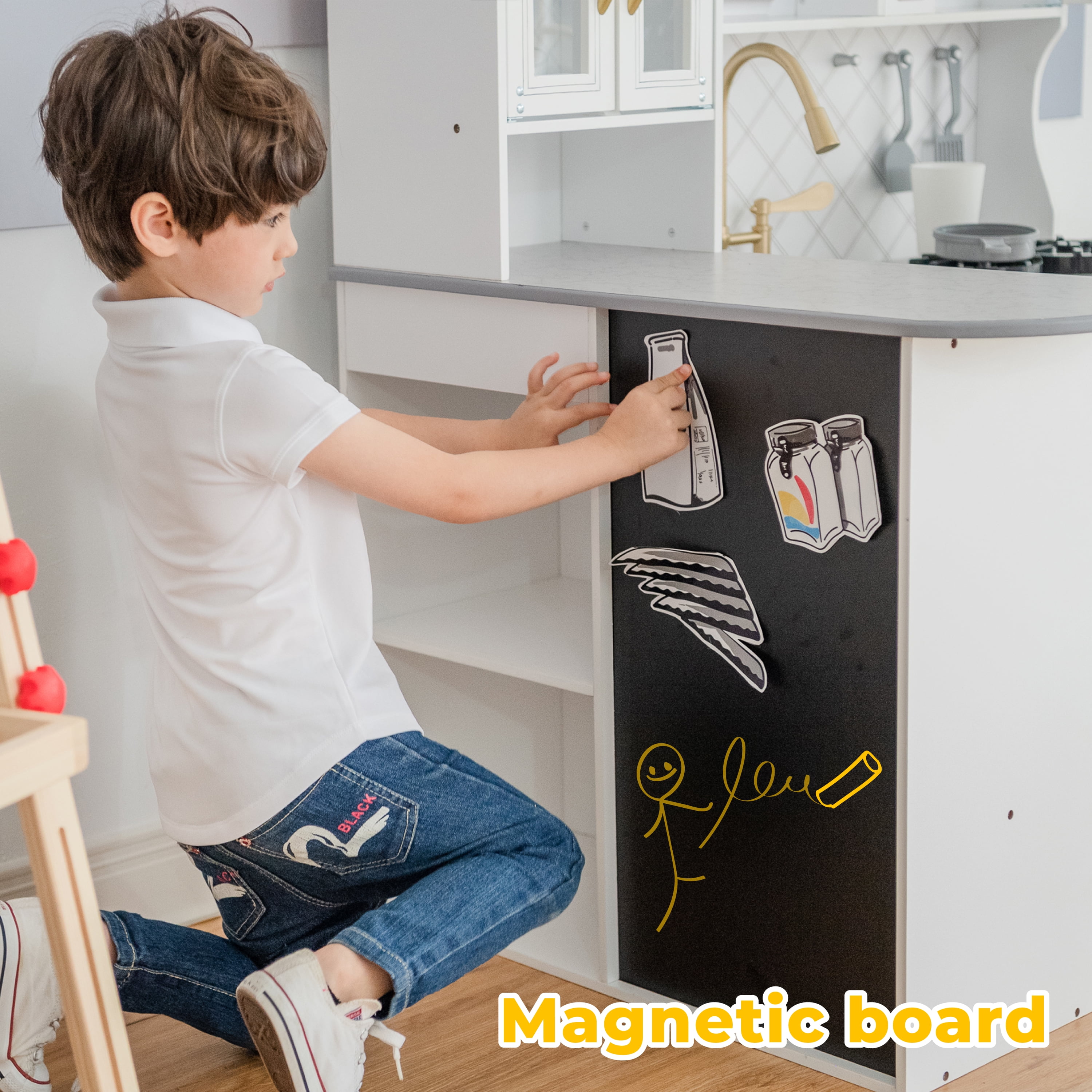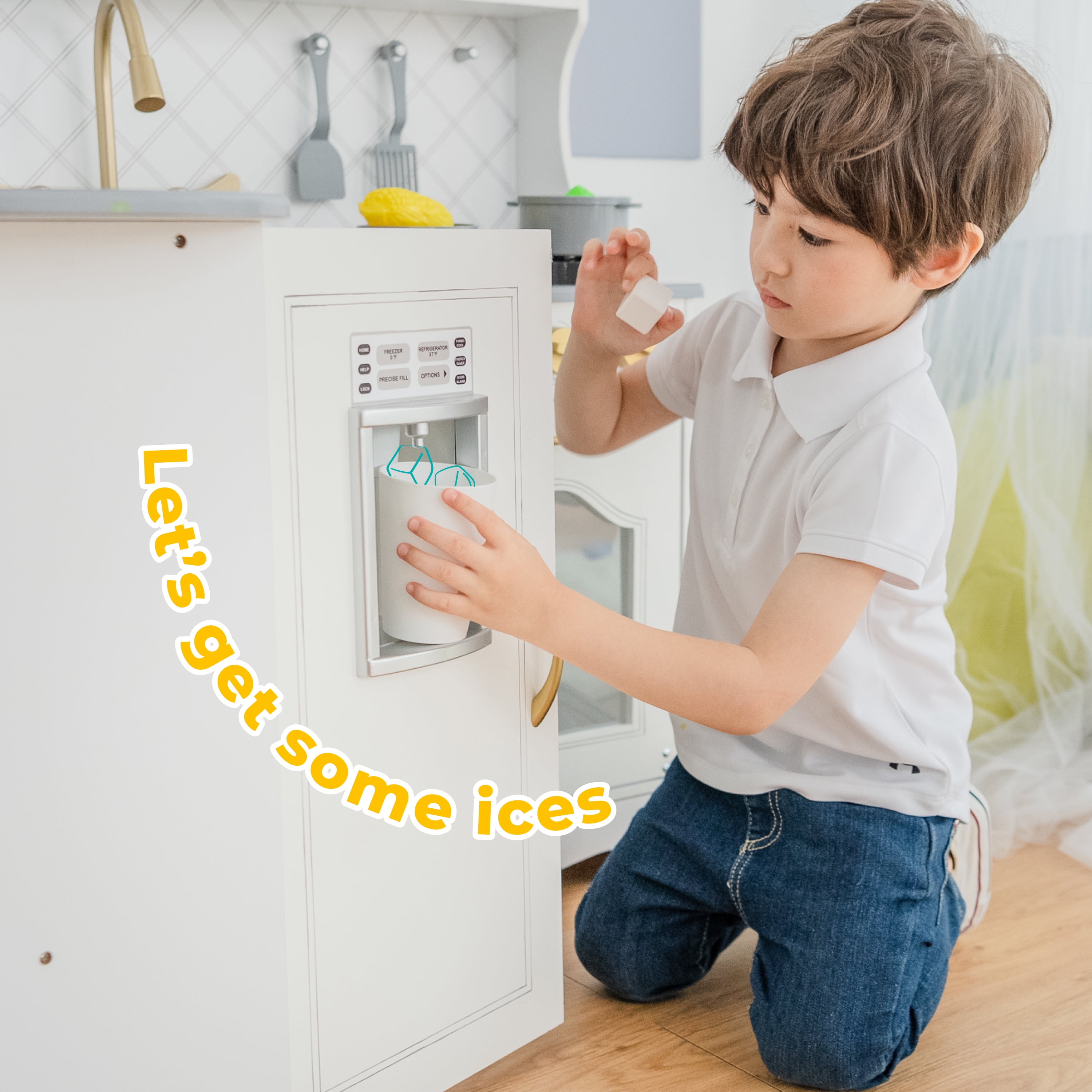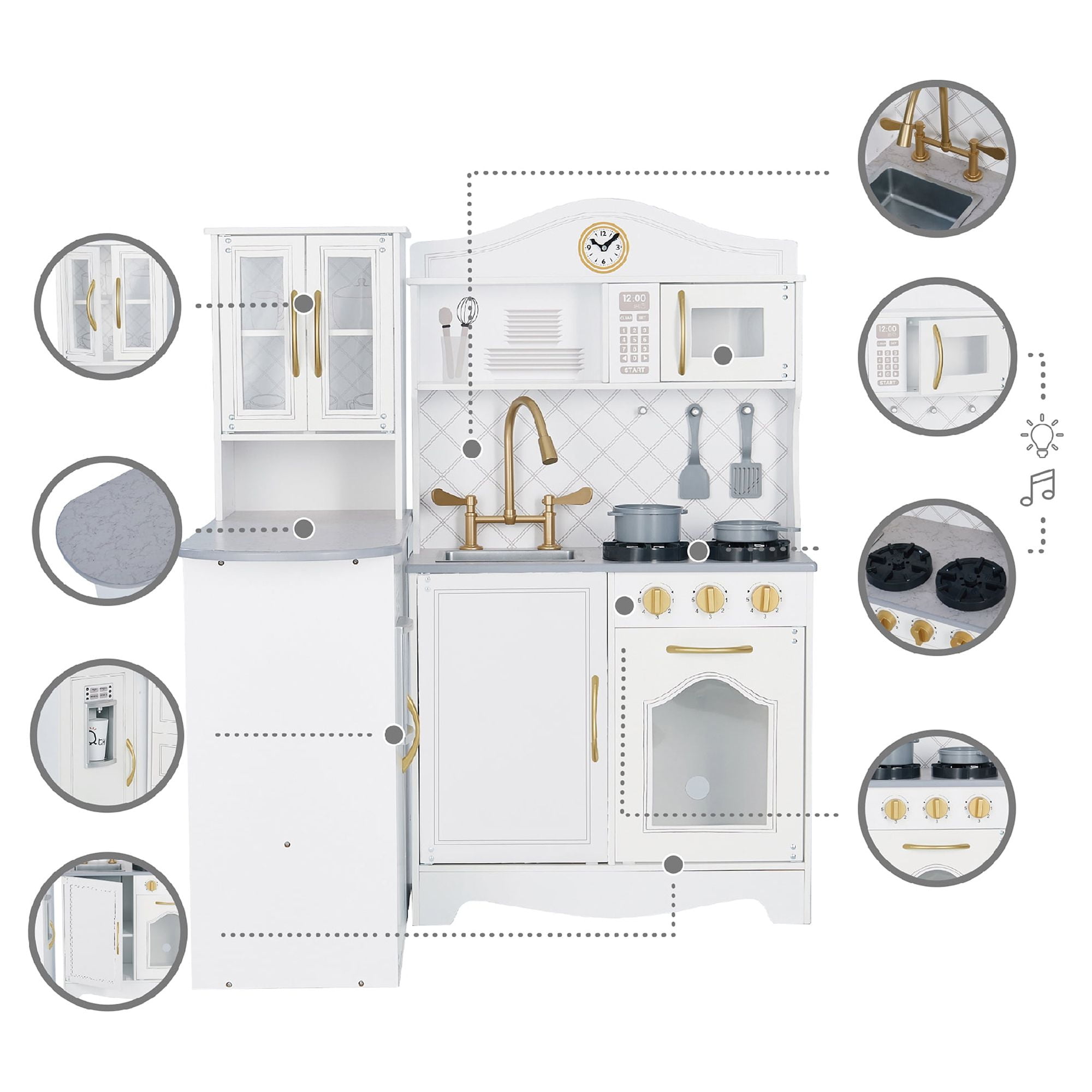 Two-piece modular wooden kitchen playset in white and gold Interactive features include an ice dispenser, rotating oven knobs, and turning faucet handles Realistic sound effects and lights Magnetic chalkboard panel for lists and notes Dimensions: 34.49 in. L x 28.5 in. W x 42.01 in. H