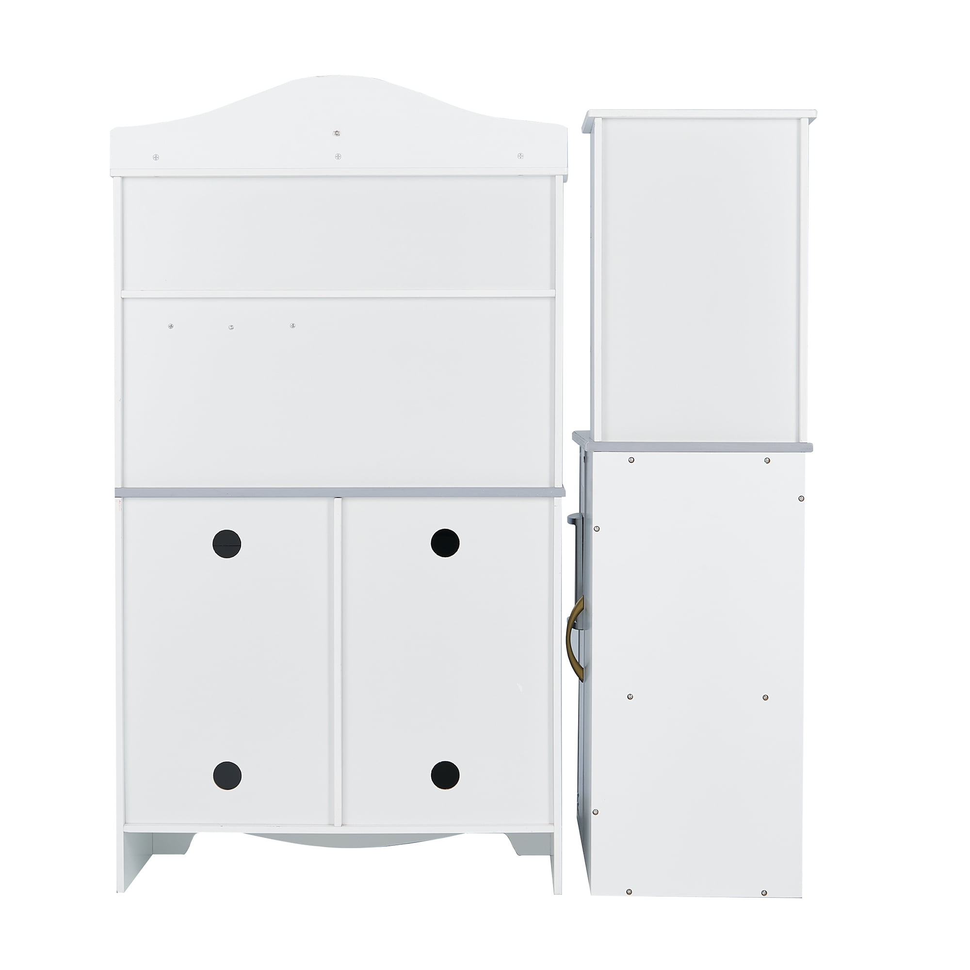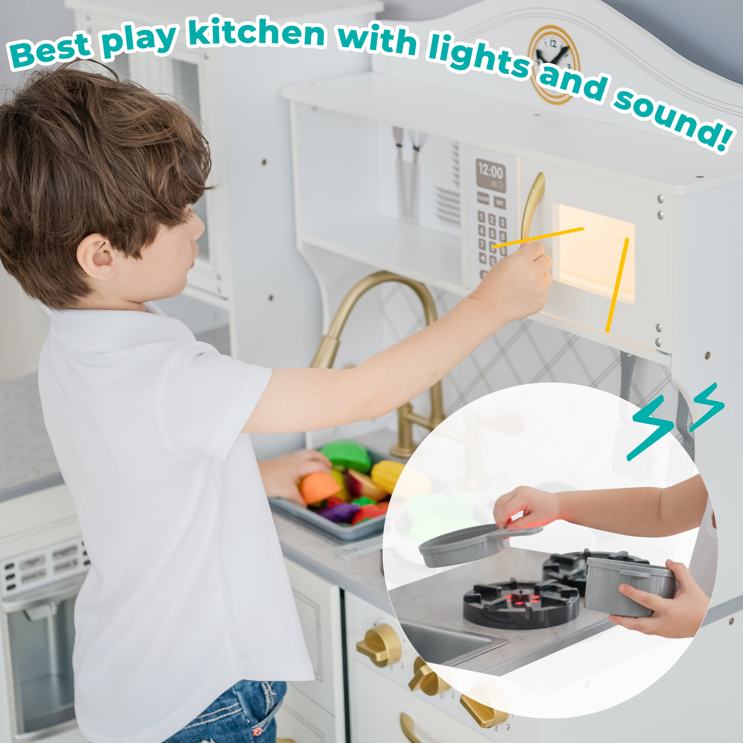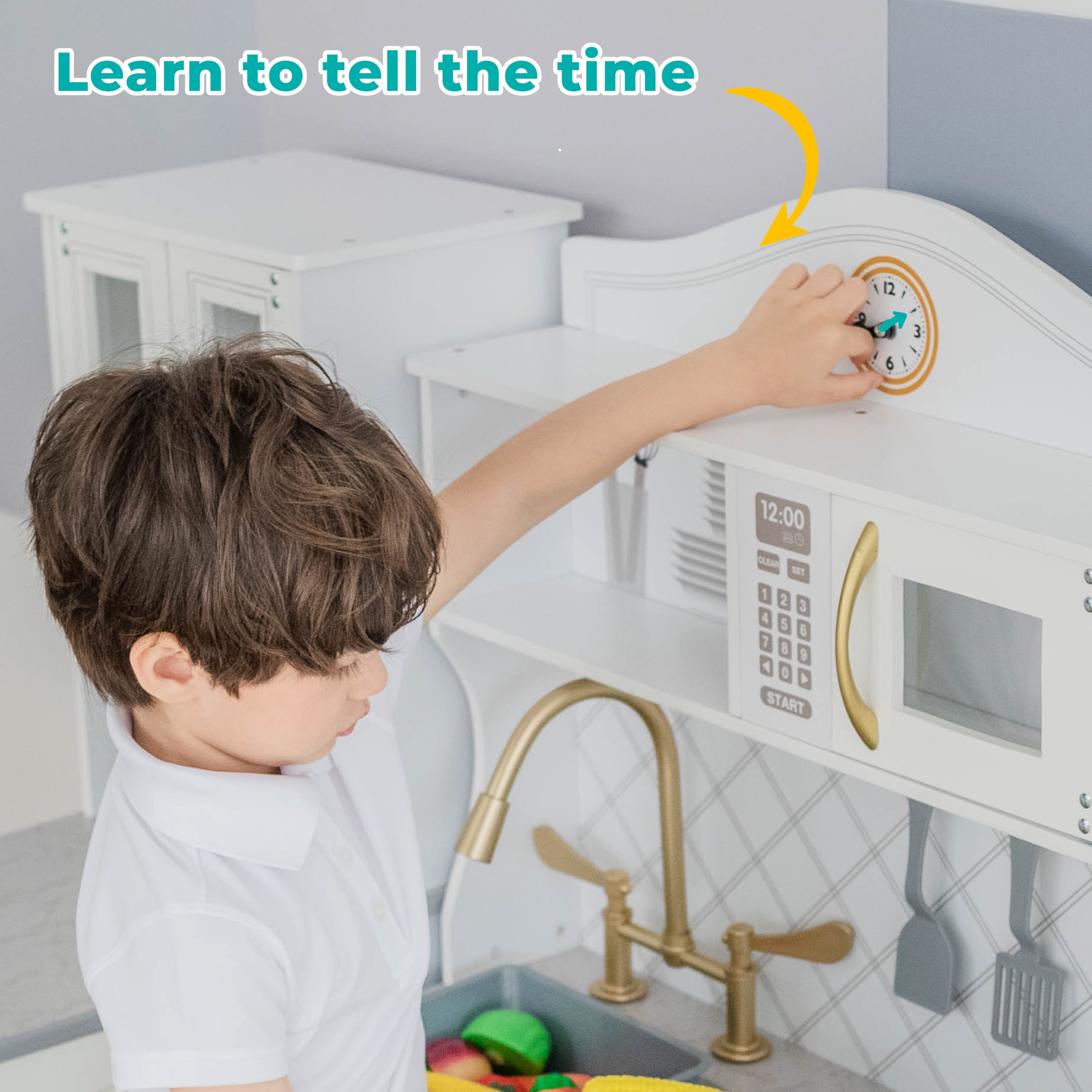 Two-piece modular wooden kitchen playset in white and gold Interactive features include an ice dispenser, rotating oven knobs, and turning faucet handles Realistic sound effects and lights Magnetic chalkboard panel for lists and notes Dimensions: 34.49 in. L x 28.5 in. W x 42.01 in. H