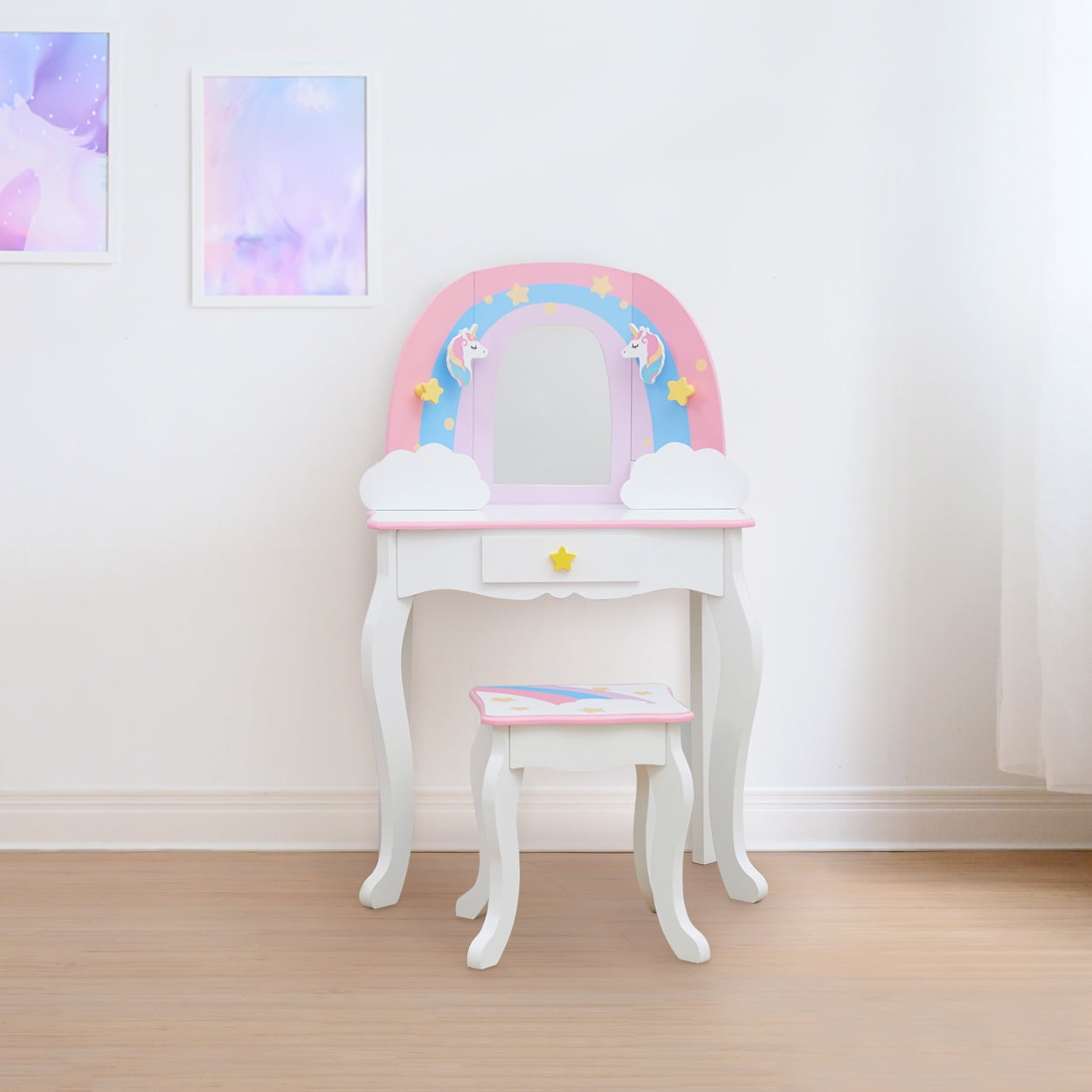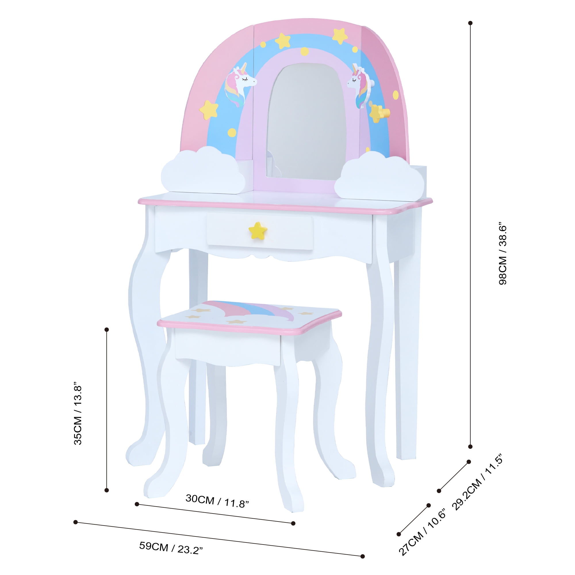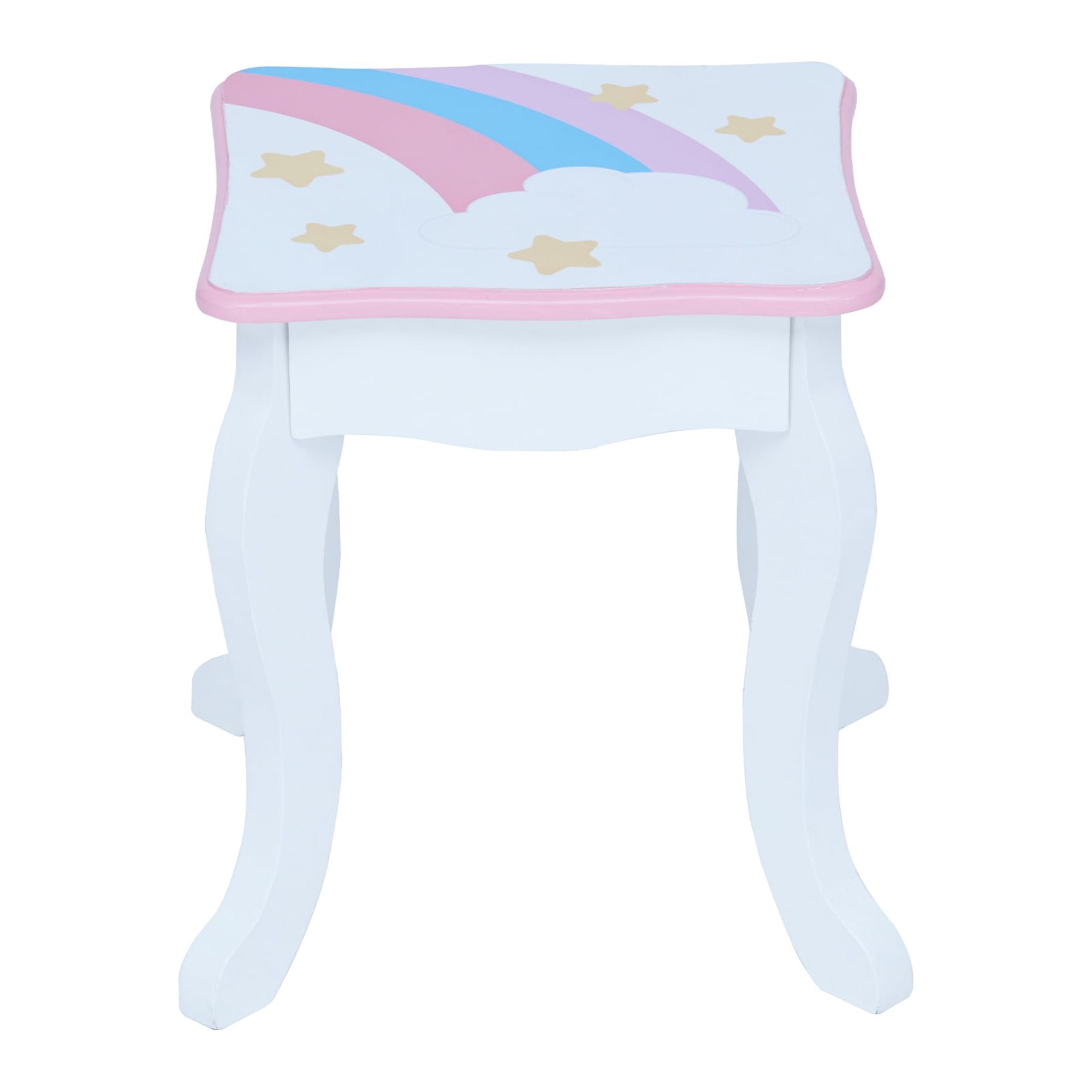 Kids vanity table with a rainbow-shaped mirror frame and three storage drawers for hair accessories, jewelry, make-up, and other treasures The matching stool fits underneath the table easily and has the same pastel color rainbow, golden stars and unicorn illustrations as the table Elegant cabriole legs, scalloped details, and child-safe rounded corners Kid-friendly acrylic mirror is impact-resistant, shatterproof, and easy to clean Table Dimensions: 24.76″ L x 12.99″ W x 39.02″ H Assembly required; Easy-to-follow instructions and hardware included