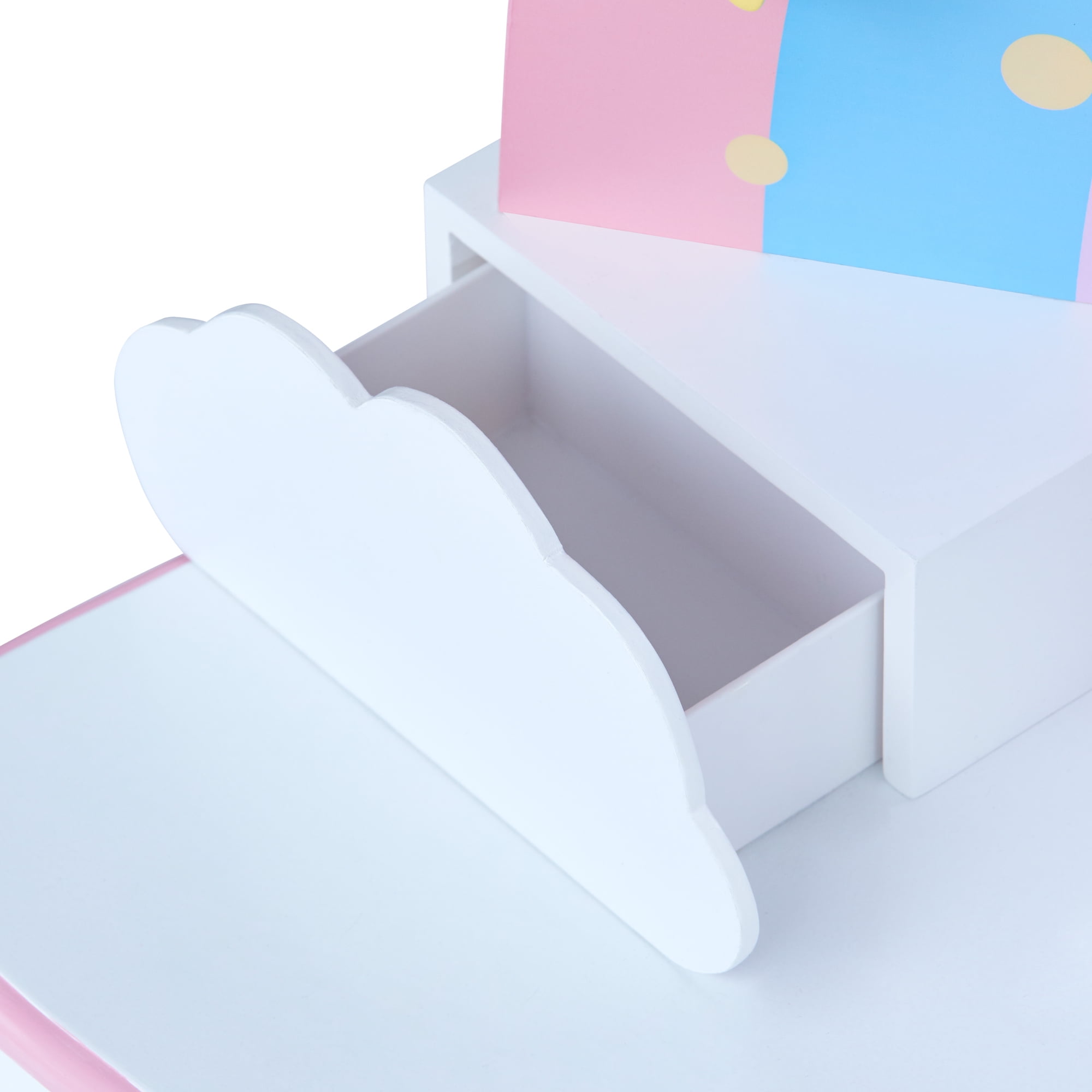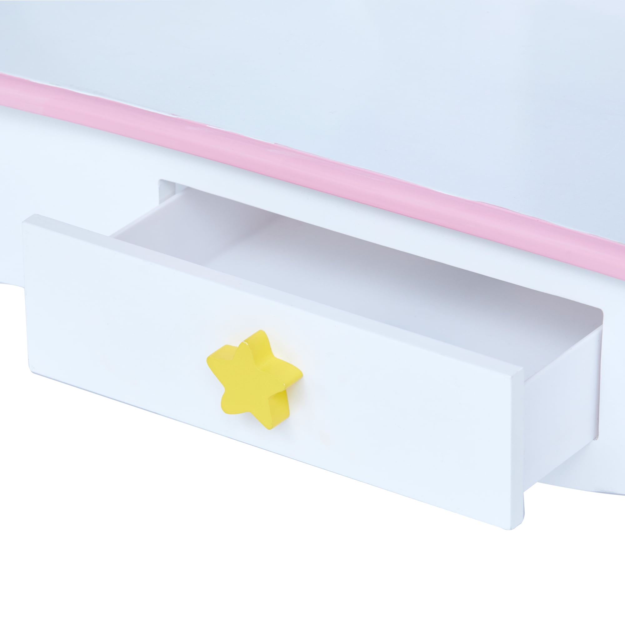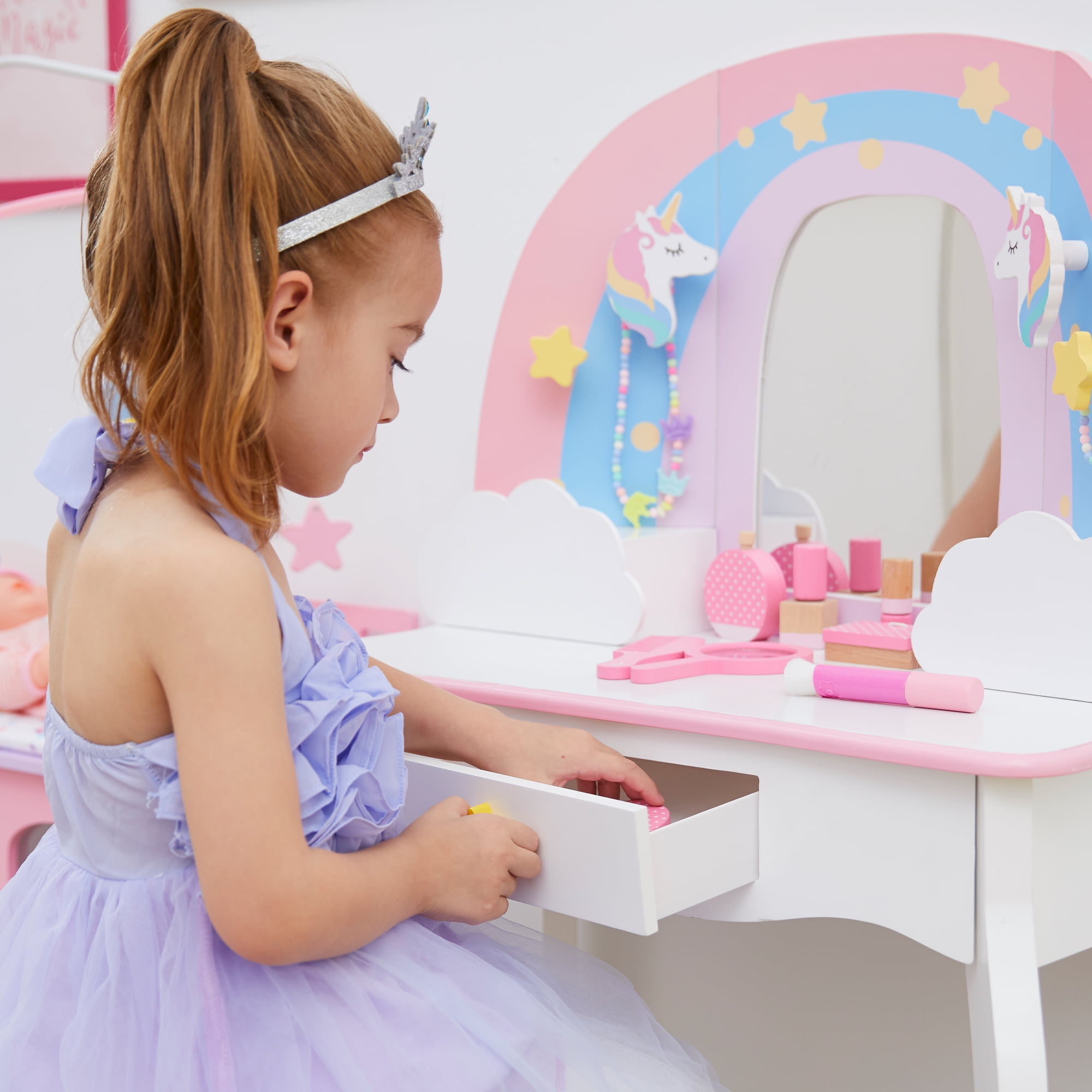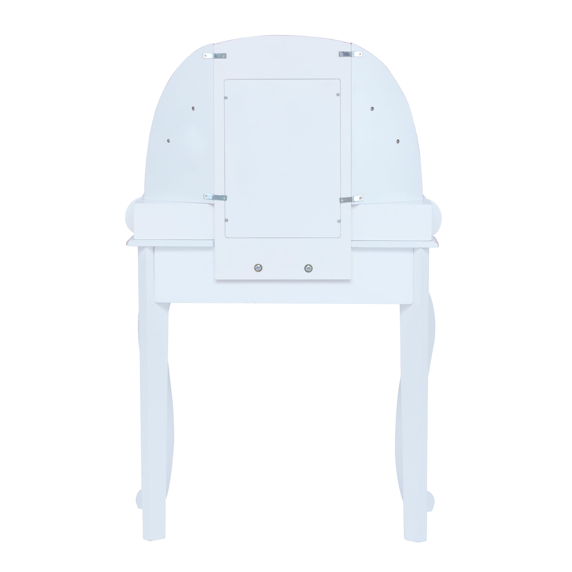 Kids vanity table with a rainbow-shaped mirror frame and three storage drawers for hair accessories, jewelry, make-up, and other treasures The matching stool fits underneath the table easily and has the same pastel color rainbow, golden stars and unicorn illustrations as the table Elegant cabriole legs, scalloped details, and child-safe rounded corners Kid-friendly acrylic mirror is impact-resistant, shatterproof, and easy to clean Table Dimensions: 24.76″ L x 12.99″ W x 39.02″ H Assembly required; Easy-to-follow instructions and hardware included