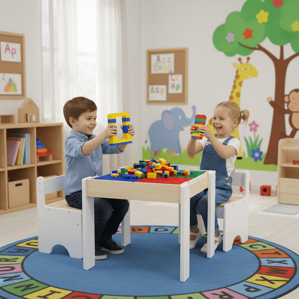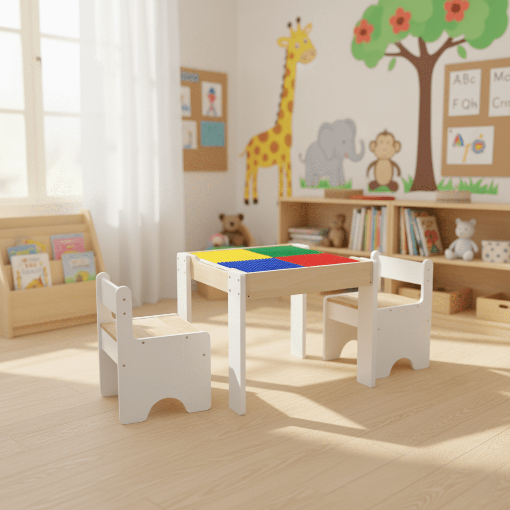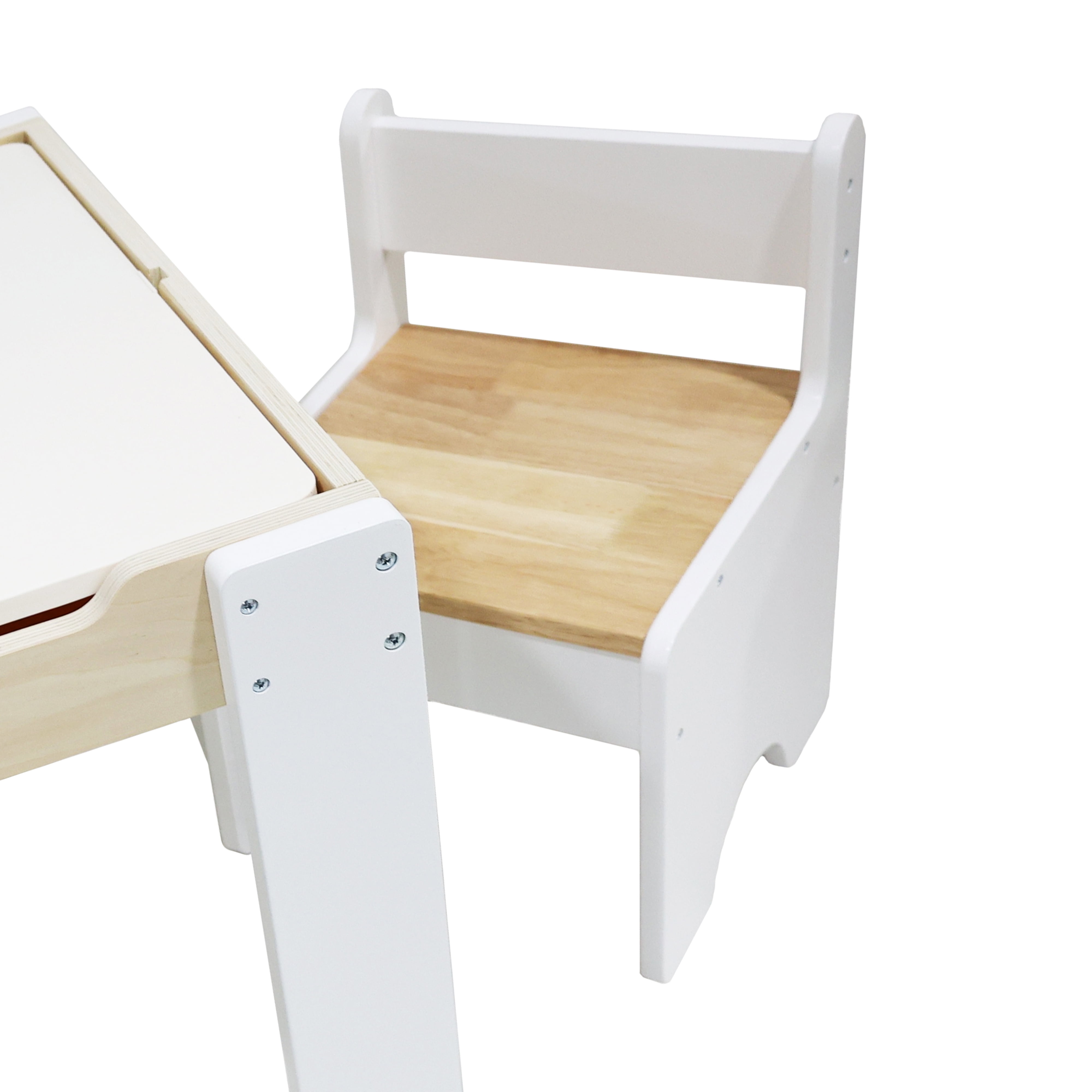 Teamson Kids Multi-Activity Table with Reversible Tabletop & Chairs Set, Kids and Toddler Playroom. This sturdy wooden 3-piece children’s set features a lightweight design and a double-sided tabletop that flips between a building block baseplate and a dry-erase surface, keeping little ones entertained for hours. Build masterpieces, then flip the tabletop over for drawing and learning – perfect for budding artists and architects. The table features spacious storage under the table, ideal for art supplies, blocks, etc. They are finished in a wipeable white and natural wood. Model Number: TD-13955C