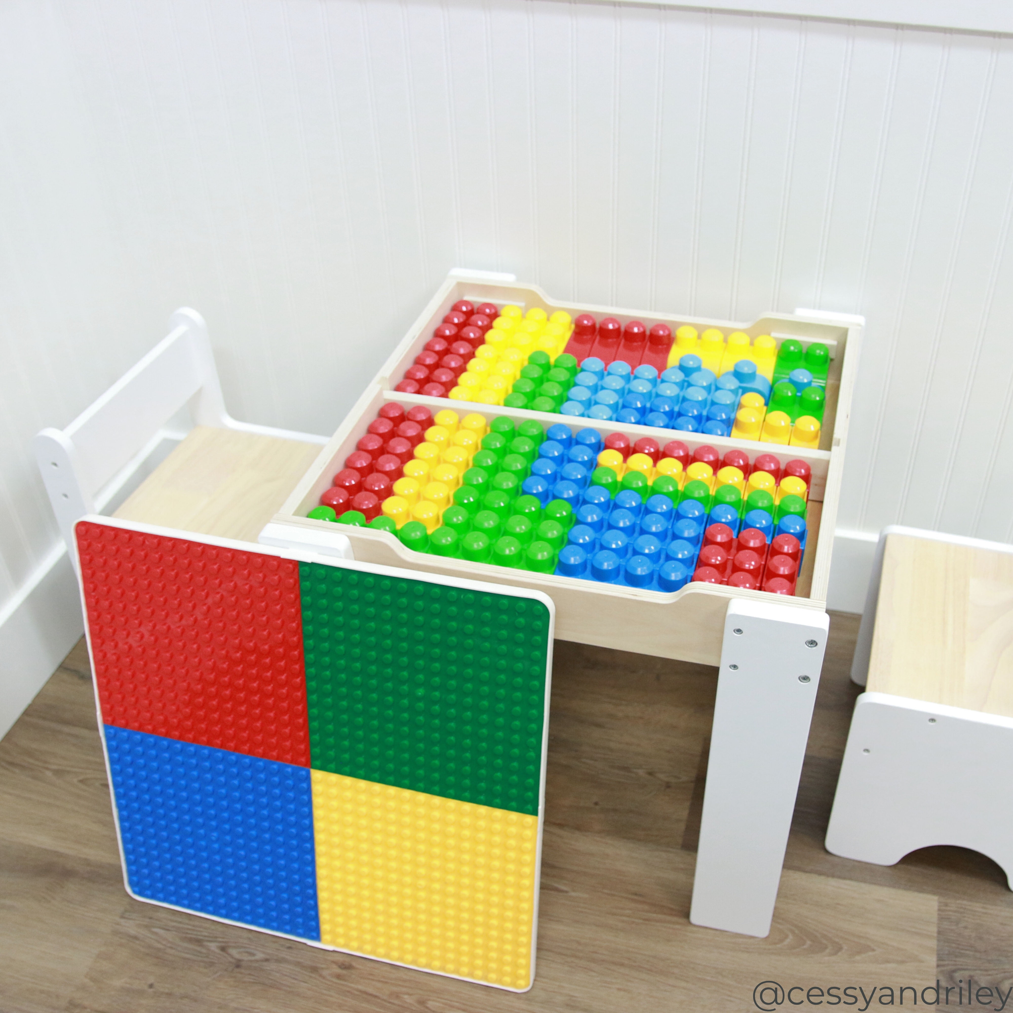 HIGH QUALITY, STABLE, SAFE: Made of sustainable MDF(Medium-density fibreboard), complying with CPSIA(Consumer Product Safety Improvement Act) for your kids to play and read in safe environment. VERSATILE PIECE FOR PLAYROOMS: Double-sided tabletop that flips between a building block baseplate and a dry-erase surface KEEP SPACES TIDY AND ORGANZIED: Spacious storage under the table, ideal for art supplies, blocks, etc. KID-FRIENDLY MATERIALS: A wipeable white and natural wood surface SAFE FOR LITTLE ONES TO MOVE AROUND: A lightweight, space-saving size that is durable for young creators DIMENSIONS: 19.25 in. L x 19.0 in. W x 19.25 in. H MODEL NUMBER: TD-13955C ASSEMBLY REQUIRED: Phillips Screwdriver recommended