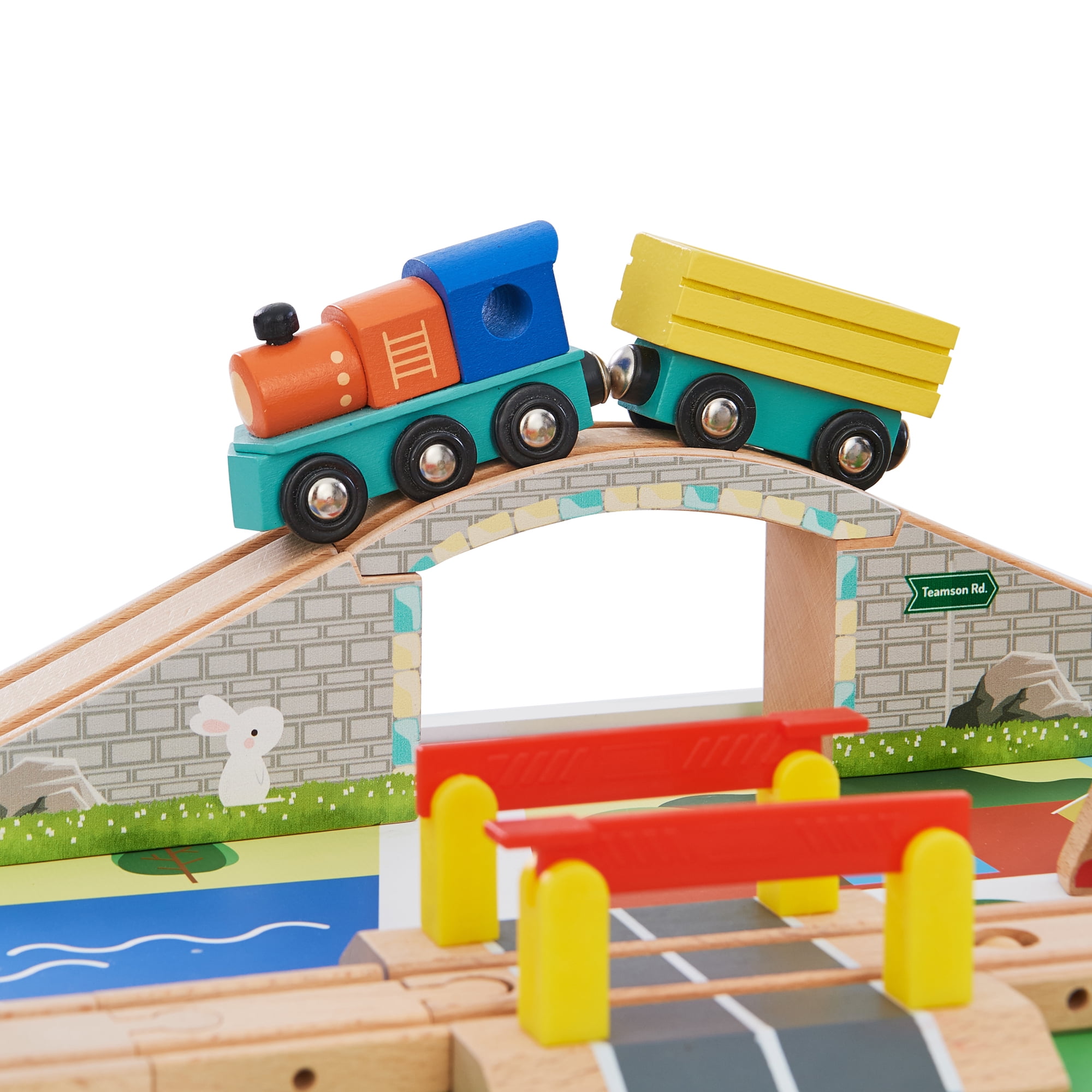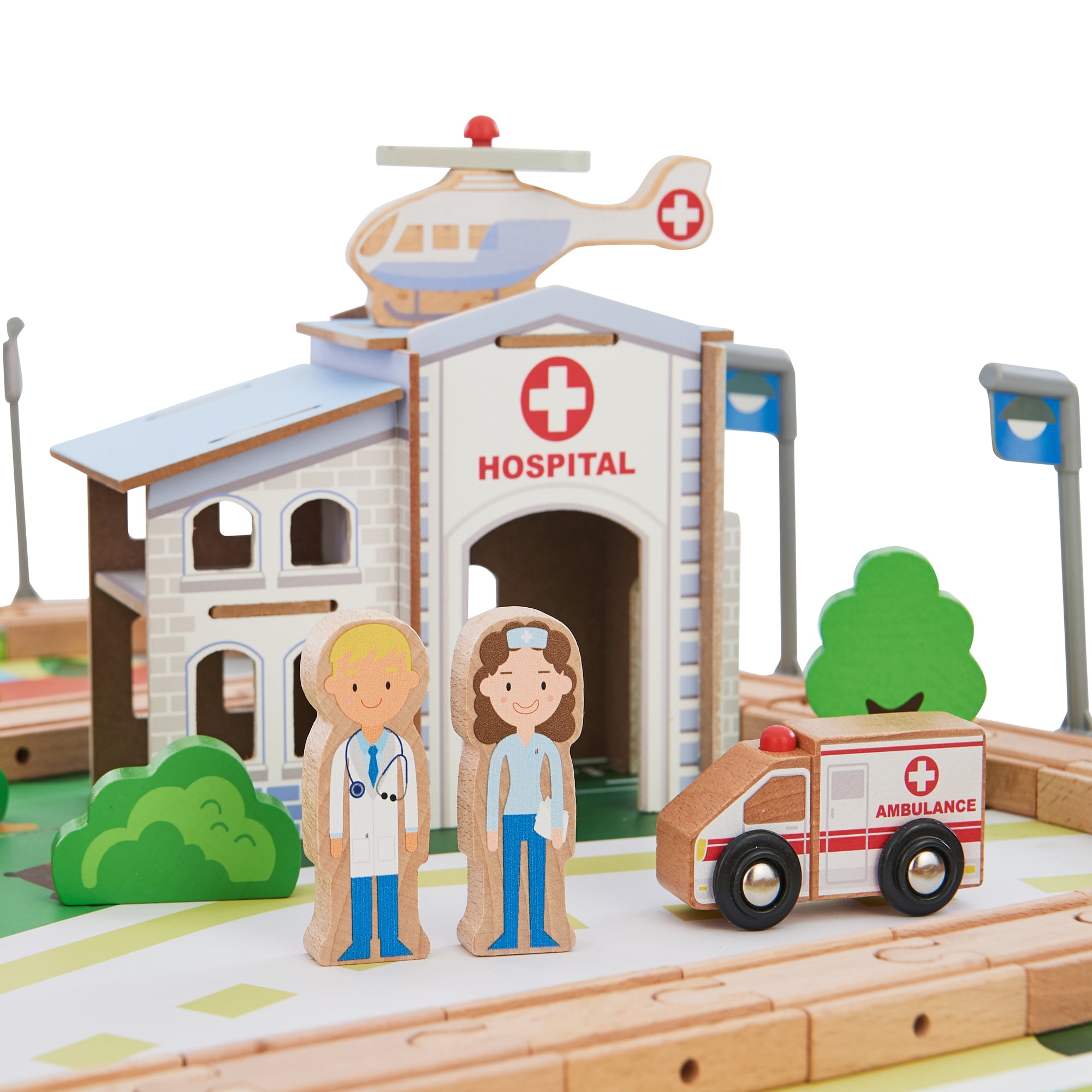 85 wooden toy pieces included: one fire station, two firemen, one hospital, two doctors/medical personnel, one railroad crossing, an ambulance, fire engine, two helicopters, one wooden toy train with attachable cart, trees and bushes, road signs, one bridge, and wooden toy train track pieces. Detailed illustrations on the figurines, set pieces, and the tabletop Spinning rotor blades on helicopters, cargo car attaches to the train magnetically Recommended for ages 3 and up Table Dimensions: 28.74″ L x 23.62″ W x 14.88″ H