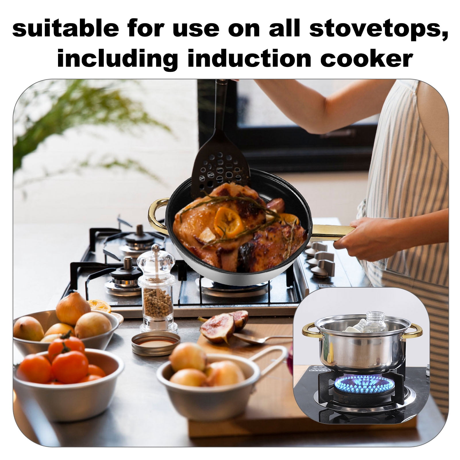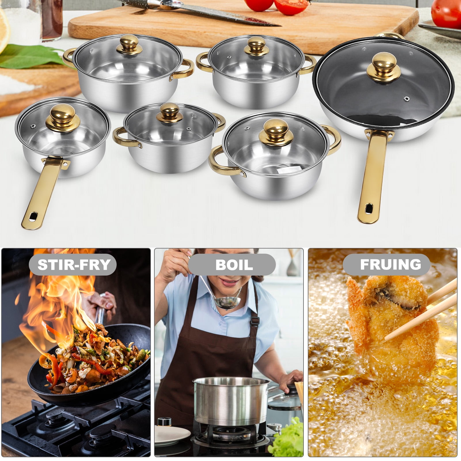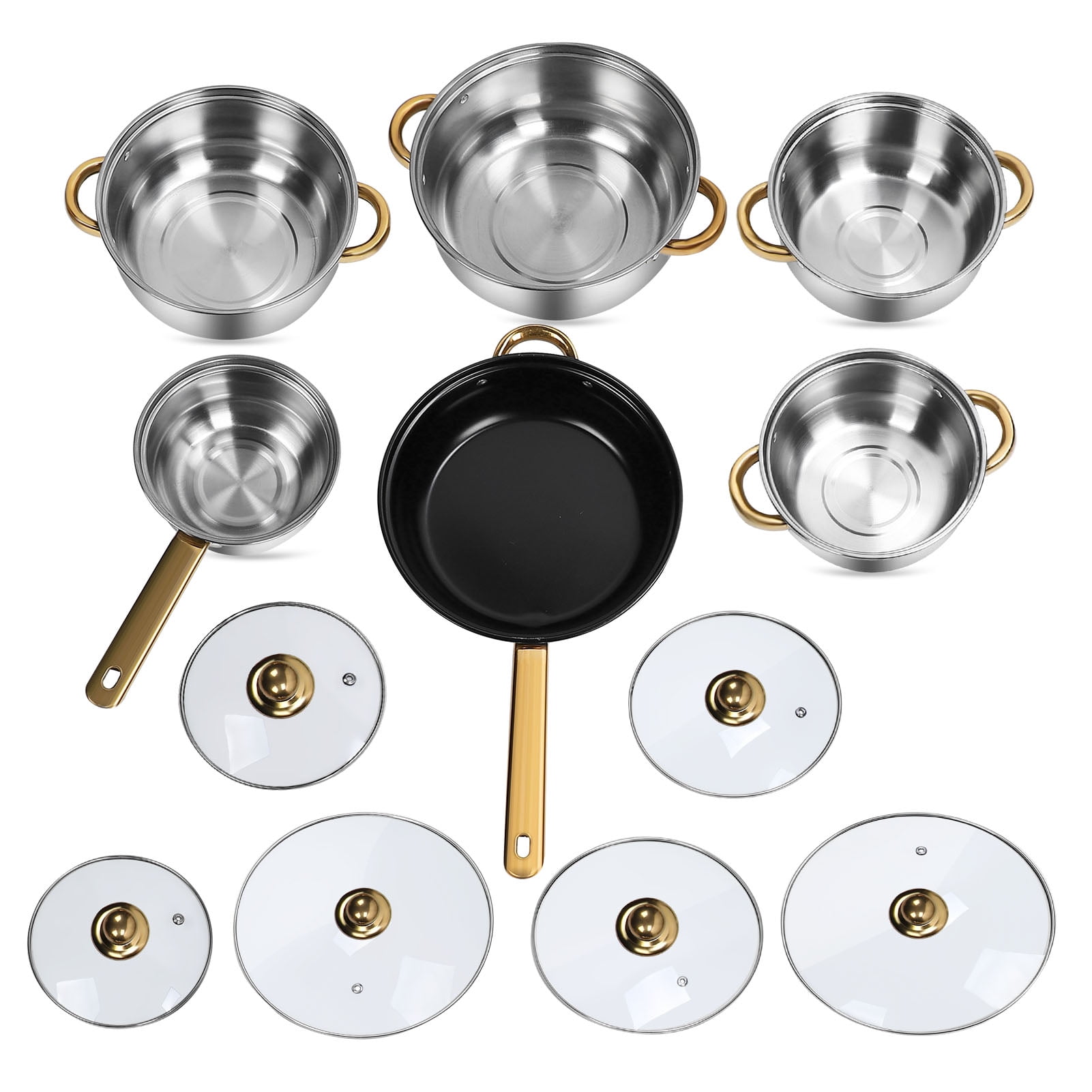 Tebru 12 Piece Nonstick Stainless Steel Cookware Set Stainless Steel Material: Made of premium stainless steel, this cookware set is high temperature resistant, easy to clean, and durable Full Set of Pots and Pans: Includes a variety of sizes and types of pots and pans, such as frying pan, saucepan, and soup pots, to meet diverse cooking needs Elegant and Stylish Design: Features a gold handle design that adds a touch of elegance to your kitchen decor Energy Efficient: Offers powerful heat transfer performance, saving cooking time and energy consumption for delicious meal preparation Stovetop Applicable: Suitable for use on all stovetops, including induction cookers, with a design that heats up quickly and evenly
