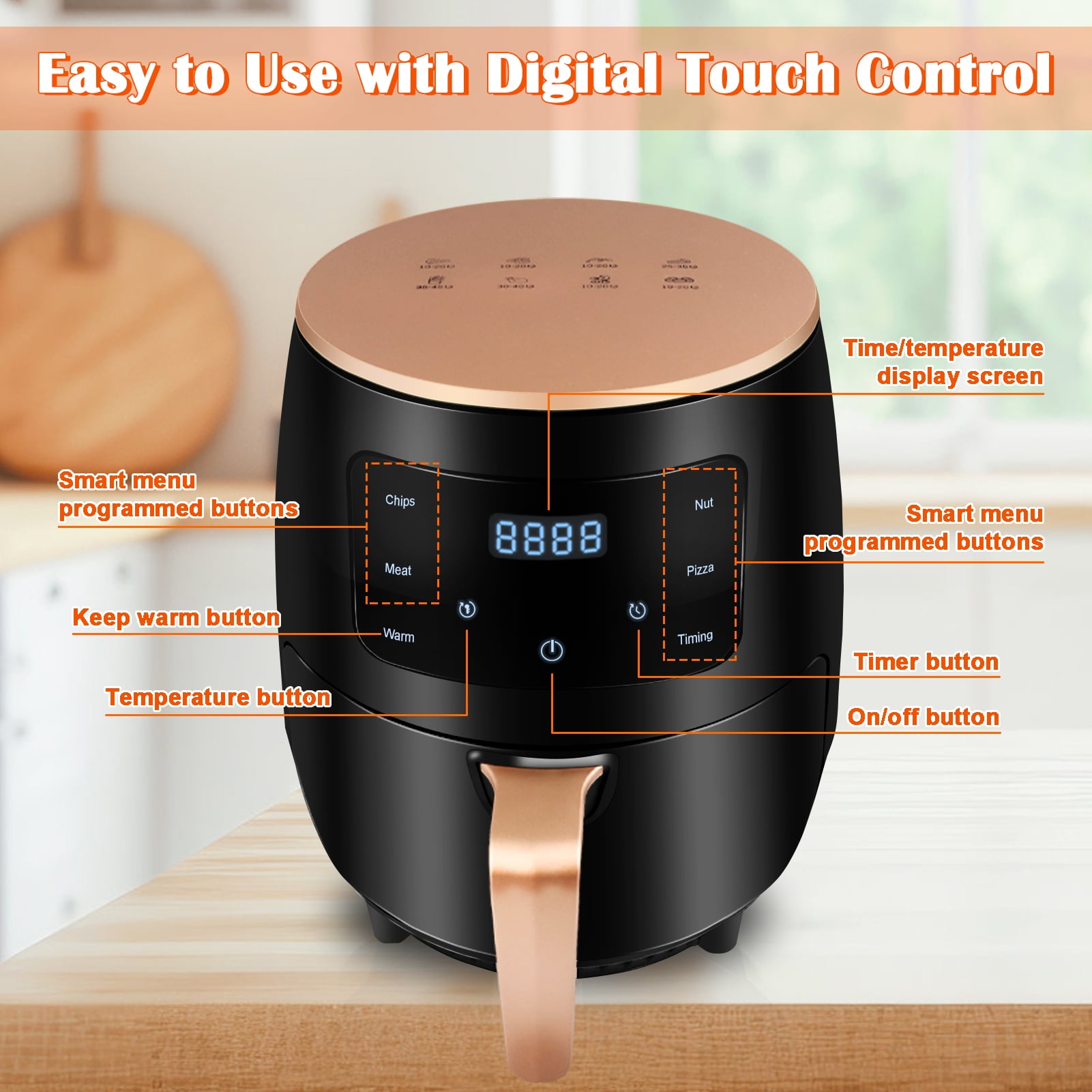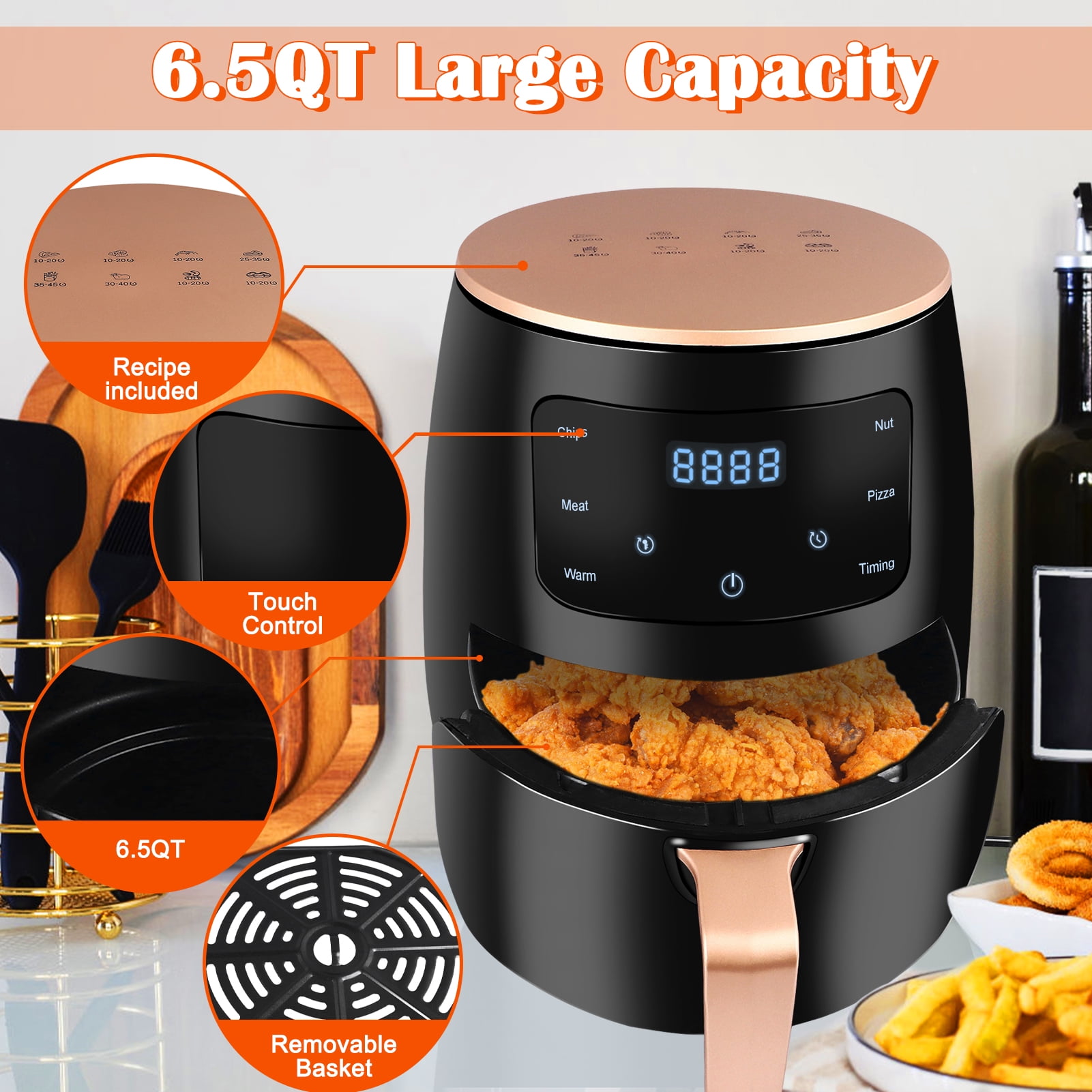 Tebru 6.5 qt Air Fryer, Black – Touch Screen Large Capacity: Cook enough food for your whole family with the spacious 6.5 qt capacity, making it perfect for preparing big meals in just one batch Healthier Cooking: Enjoy delicious fried dishes with less oil, this electric oilless fryer allows you to indulge in your favorite foods without compromising your health and wellness Versatile Use: This versatile electric oilless cooker serves as a fryer, baking oven, grill, and roaster, providing you with a wide range of cooking options to suit your culinary needs Easy to Use: The intuitive computer-style control panel makes it easy for you to select your preferred cooking settings and keep track of the progress of your meal Fast Heating and Efficient: Featuring quick heating technology, this electric oilless cooker offers fast, energy-efficient cooking