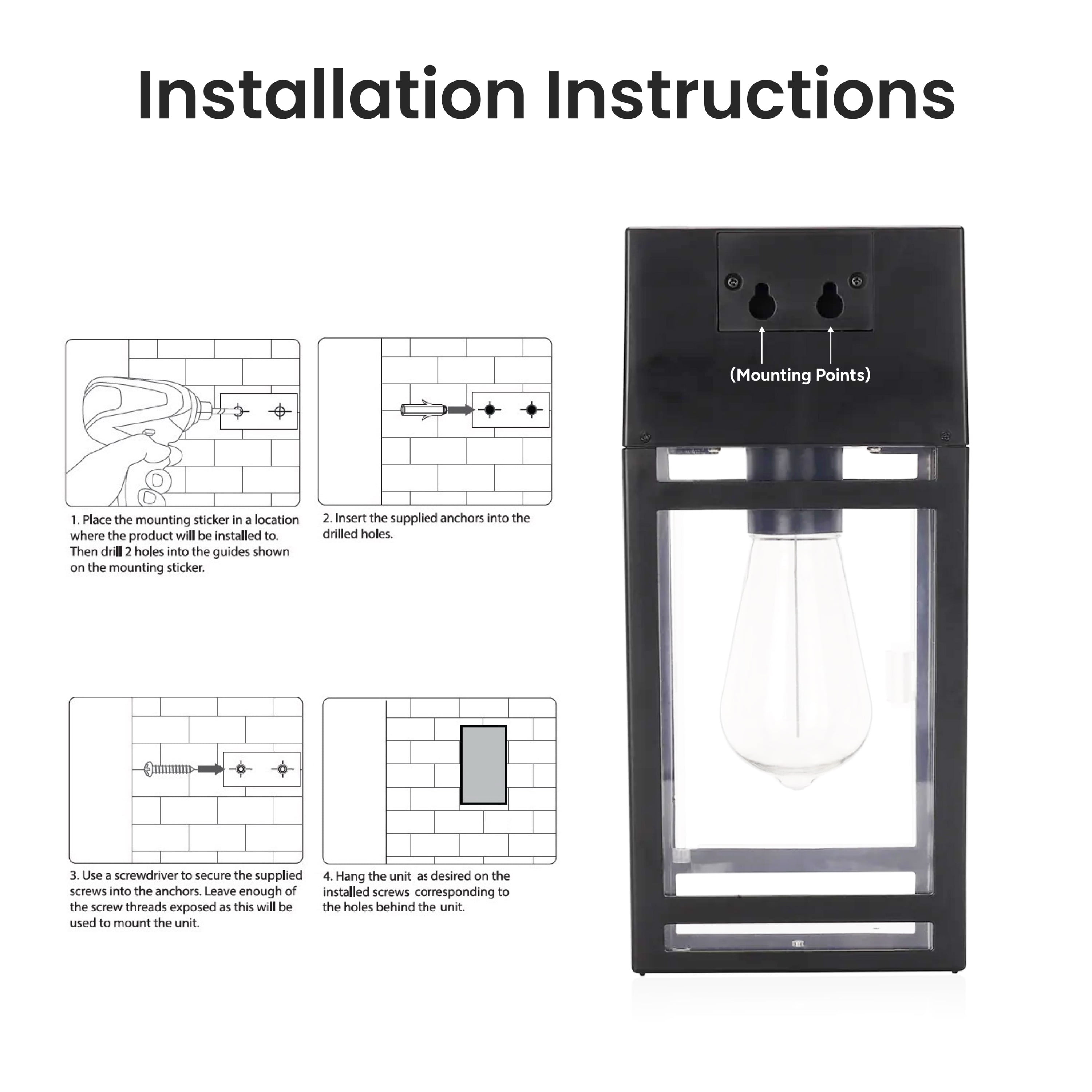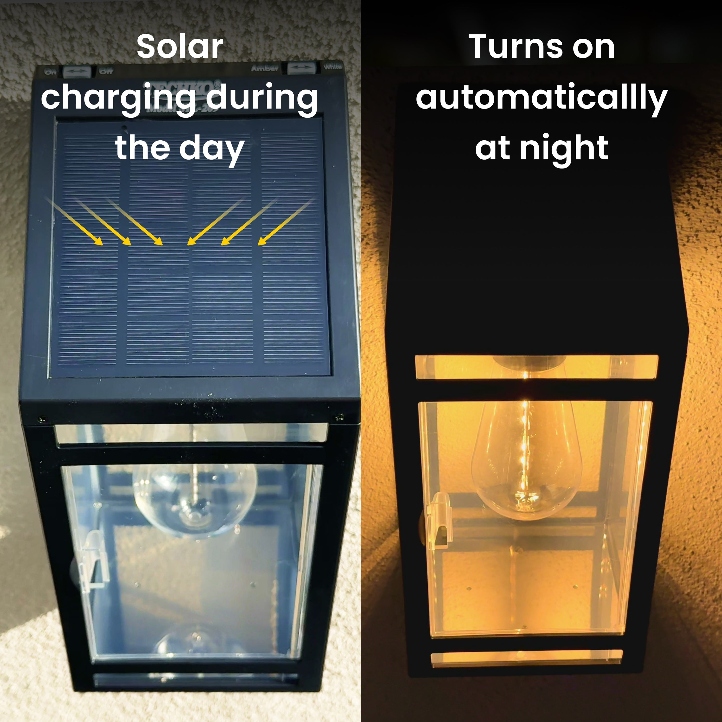 Lights up to 12 hours on a full charge Automatically lights up at dusk Option for amber or white light effect Easy to install on the wall Excellent function as a night light, lighting up entrances and outdoor entertaining areas IP65 Waterproof rating Contains one wall lantern