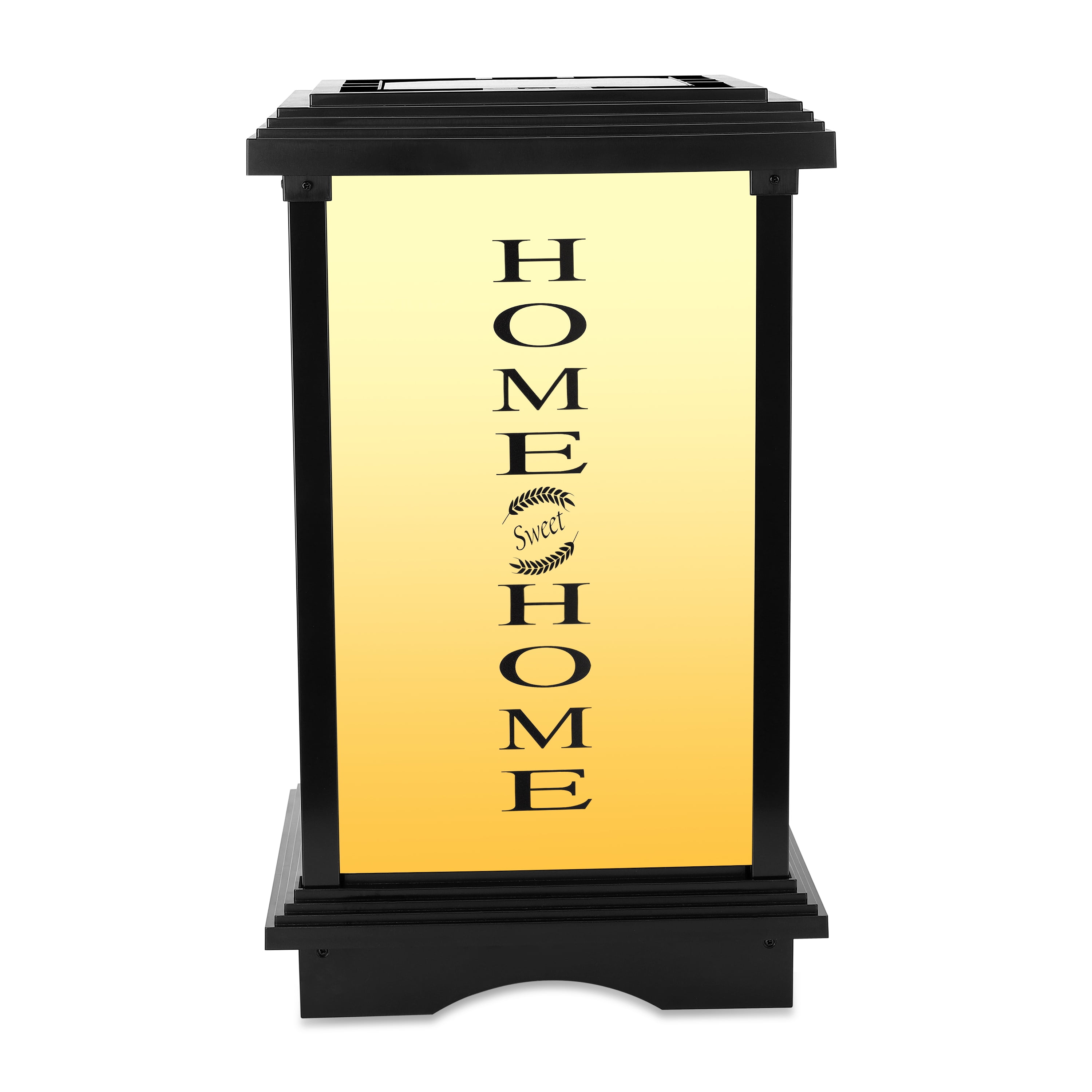 Lights up to 12 plus hours on a full charge Automatically charges and turns on at dusk and off at dawn Option for warm amber or bright white light effect Excellent welcome or home sweet home sign for entry areas, gates, perfect for gardens and outdoor entertaining areas IP65 Waterproof performance Contains one solar lantern
