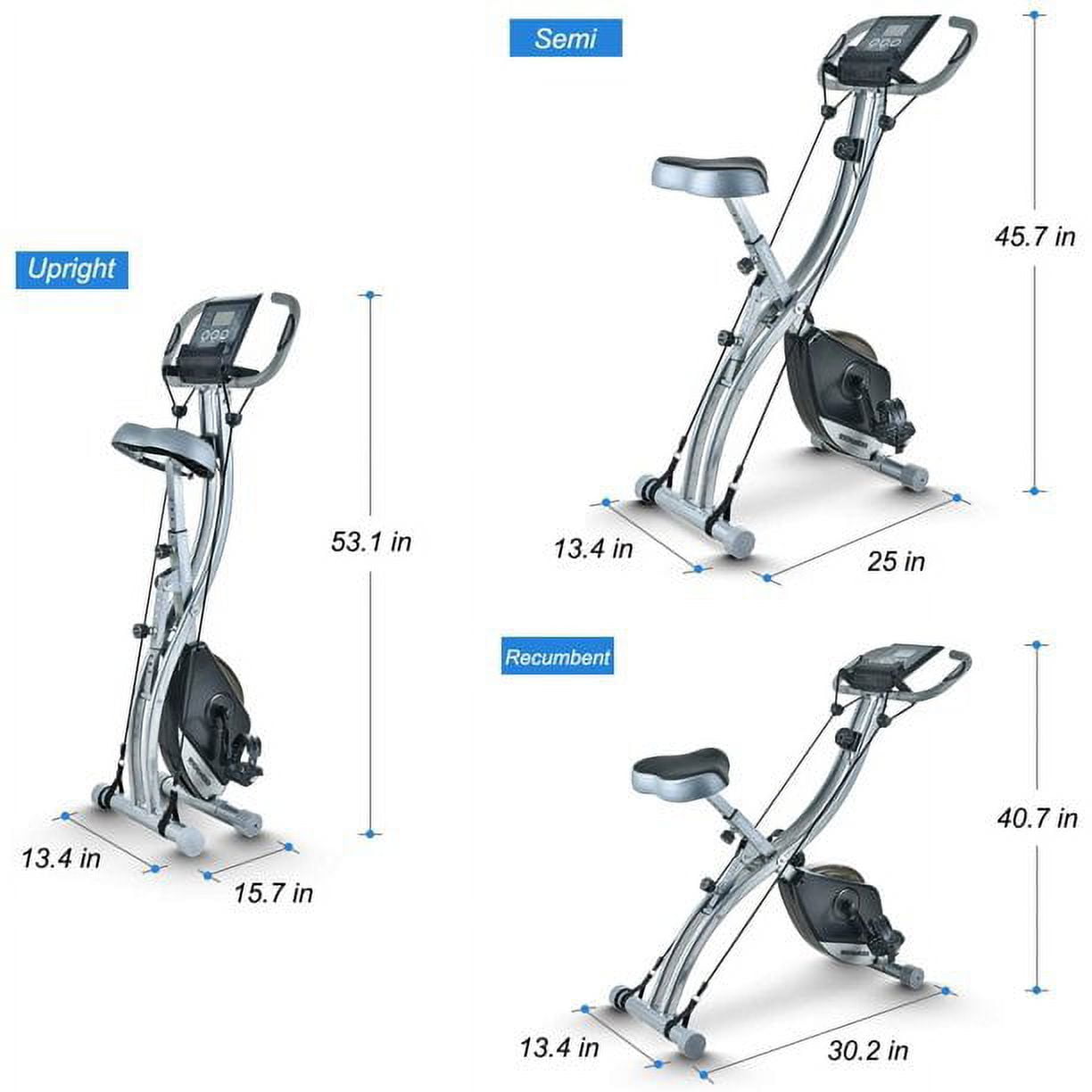 TECHMOO Fitness Exercise Bike Recumbent Indoor Workout Stationary Bike, Portable Upright Folding Magnetic Cycling Bike with Pulse Sensor LCD Monitor Front and Back Arm Resistance Bands (Black)Trying to get fit but you are short of time to go to gym?Or you don’t have enough space for an exercise machine?TECHMOO X exercise machine is made to help you with those.In addition to superior performance, TECHMOO stationary bike can also be folded to save you space.Smooth and Quiet Magnetic Resistance: Customize your home exercise bike routine with 8-levels of adjustable magnetic tension control system. Different intensity levels allow you challenge yourself and change up your routine workout by simplely adjust the tension knob.Precision balanced flywheel provides a smooth and quiet ride, do not disturb others while exercising. 3-IN-1 Exercise Bike: It can be changed into Upright, Semi-Recumbent and Recumbent Foldable Stationary Bike. The upright exercise bike helps boosts your heart rate and improve your cardio fitness. While the recumbent exercise bike is more comfortable and natural reclined body position which help reduce body fatigue and eliminate muscle soreness in the upper body. Safety Bike and Adjustable Seat: Adjustable cushioned seat provides a comfortable ride with optimal sitting position. With thickened steel tubes and durable accessories, TECHMOO exercise bike holds up to 265lbs and performs steadily. The anti-skid ends on the stabilizers effectively protect your floor from scratches. And emergency brake is built in to avoid injury. Digital LCD Monitor: Digital monitor in front of the folding stationary bike displays distance, burned calories, time, speed and heart rate which will help you more focus on the exercise. Track your heart rate with the pulse rate sensors, conveniently built-in on the handle bars. Phone holder convenience for you to watch workout videos or favorite shows while exercising. Foldable Space Saving X-Bike Design: The unique and compact design of this exercise bike can be easily folded to half of the assembled size. And it can be stored or took out by portable roller. With removal resistance bands to keep your balance and have your arms worked out. Perfect workout bike for home, apartment or office use and recommended for men, women and seniors.3 in 1 Exercise Bike: It can be changed into Upright, Semi-Recumbent and Recumbent Foldable Stationary Bike.,Precision balanced flywheel provides a smooth and quiet ride.,Safety Bike and Adjustable Seat: Adjustable cushioned seat provides a comfortable ride with optimal sitting position.,Digital LCD Monitor: Digital monitor in front of the folding stationary bike displays distance, burned calories, time, speed and heart rate which will help you more focus on the exercise.,Foldable Space Saving X-Bike Design: The unique and compact design of this exercise bike can be easily folded to half of the assembled size. Specification: Type of Resistance: Magnetic Max Load Capacity Up to 265 lbs Seat Adjustable: Yes LCD Display: Speed, Time, Distance, Calories, Heart Rate and Pulse Rat