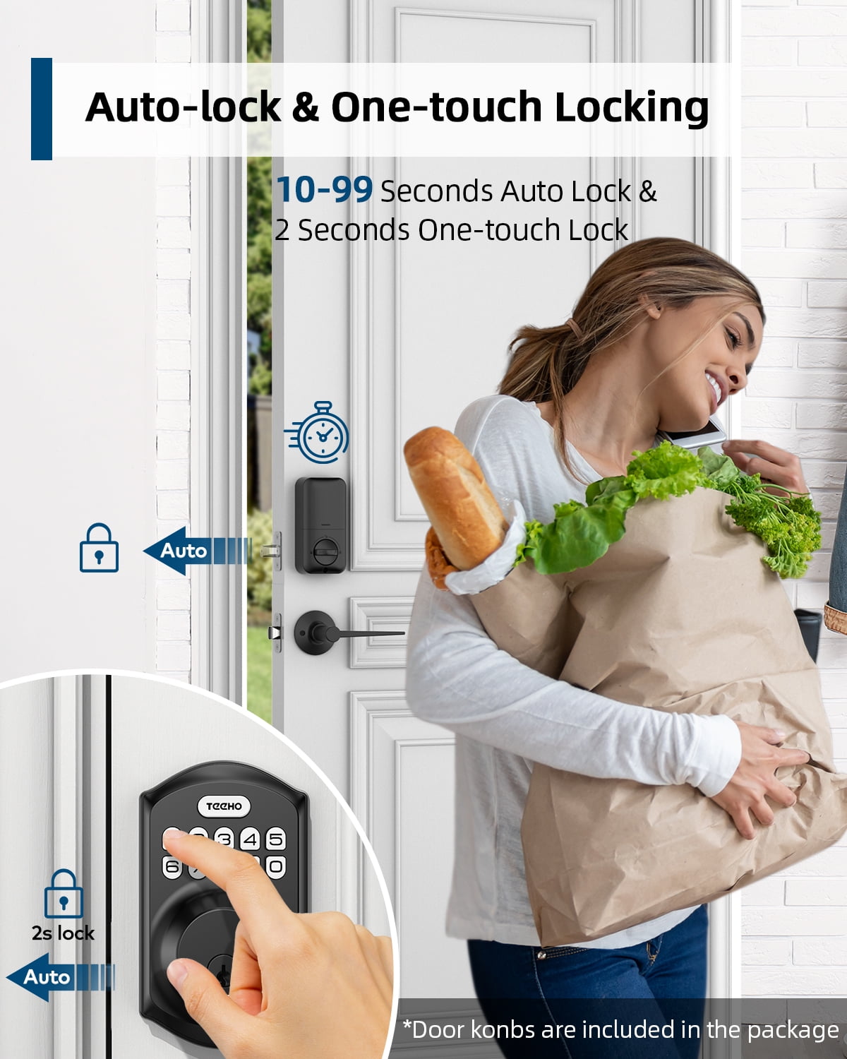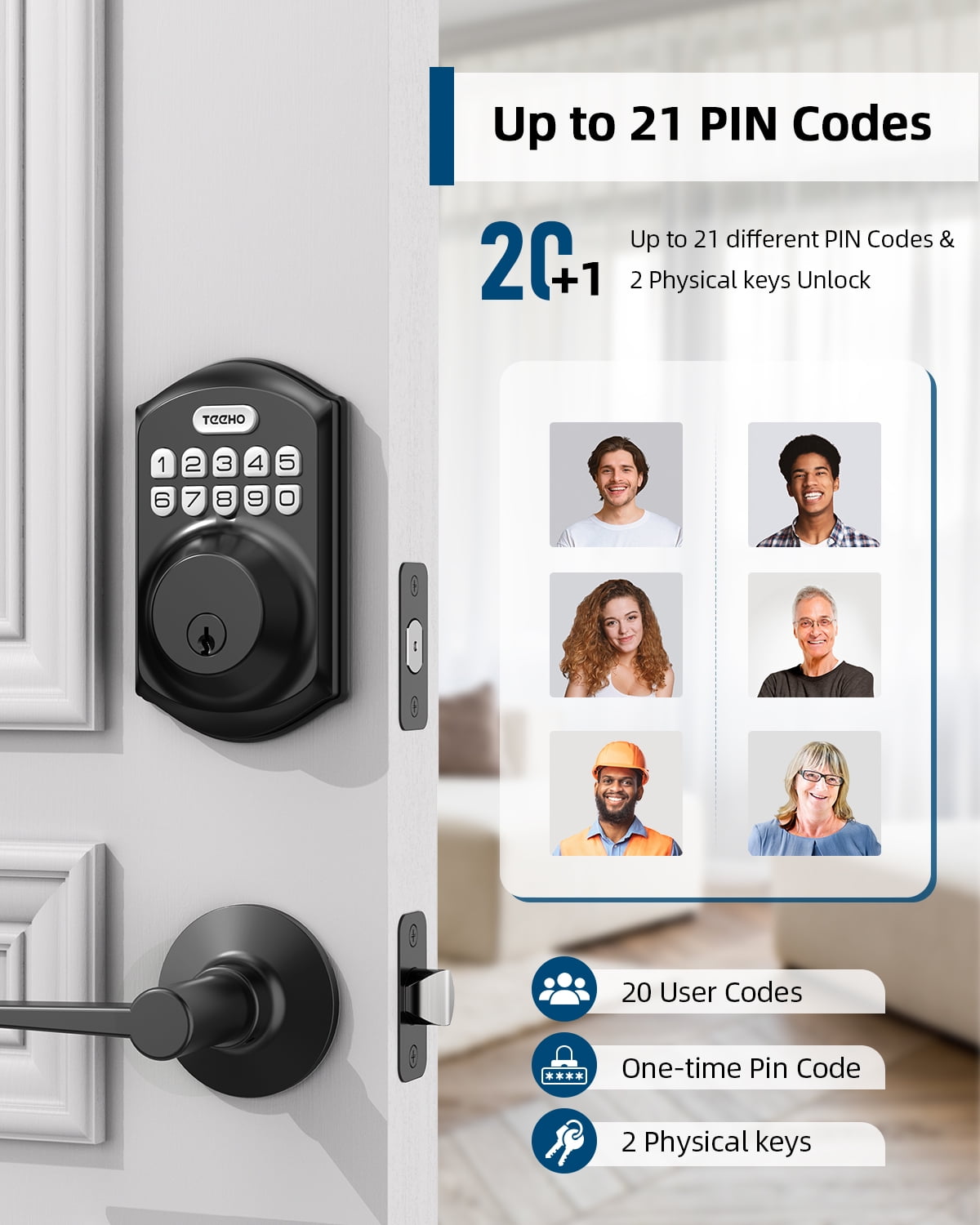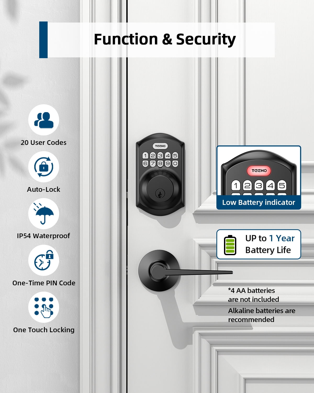???? Keyless Entry: Experience easy access with the TEEHO keyless entry door lock. It offers 20 access code options (4-10 digit codes) for hassle-free entry. No more worries about forgetting your keys! ???? One-Time Code Feature: Quickly set one-time access codes for neighbors, cleaners, or delivery personnel. Each code is automatically deleted after use, ensuring your home remains secure. ???? Smart-Locking: The smart lock features an automatic locking function that can be set to engage in 10-99 seconds. For added convenience, use the one-touch auto-lock option—just hold any key on the keypad for 2 seconds. ???? Combination Door Lock: This front door lock set includes 2 door lever handles and a keypad deadbolt. It features an anti-peeping password, mute mode, vacation mode, and a backlit keypad, making it perfect for both traditional and modern homes. ???? Security Deadbolt: Our keypad door lock includes an ANSI Grade 3 smart cylinder made of durable alloy. It runs on 4 AA batteries, providing over 1 year of reliable use, and boasts an IP54 weather resistance rating. ???? Easy Installation: Install your new lock in just minutes using a screwdriver—no special tools needed! It’s designed for anyone to set up easily and is suitable for standard 2-1/8″ (54mm) door holes only. ???? Quality Assurance: TEEHO offers a 30-day customer satisfaction commitment and 1-year product support for all components. Enjoy lifetime after-sales service, including online phone support from Monday to Friday, 9 AM to 5 PM PST, and 24/7 email support.