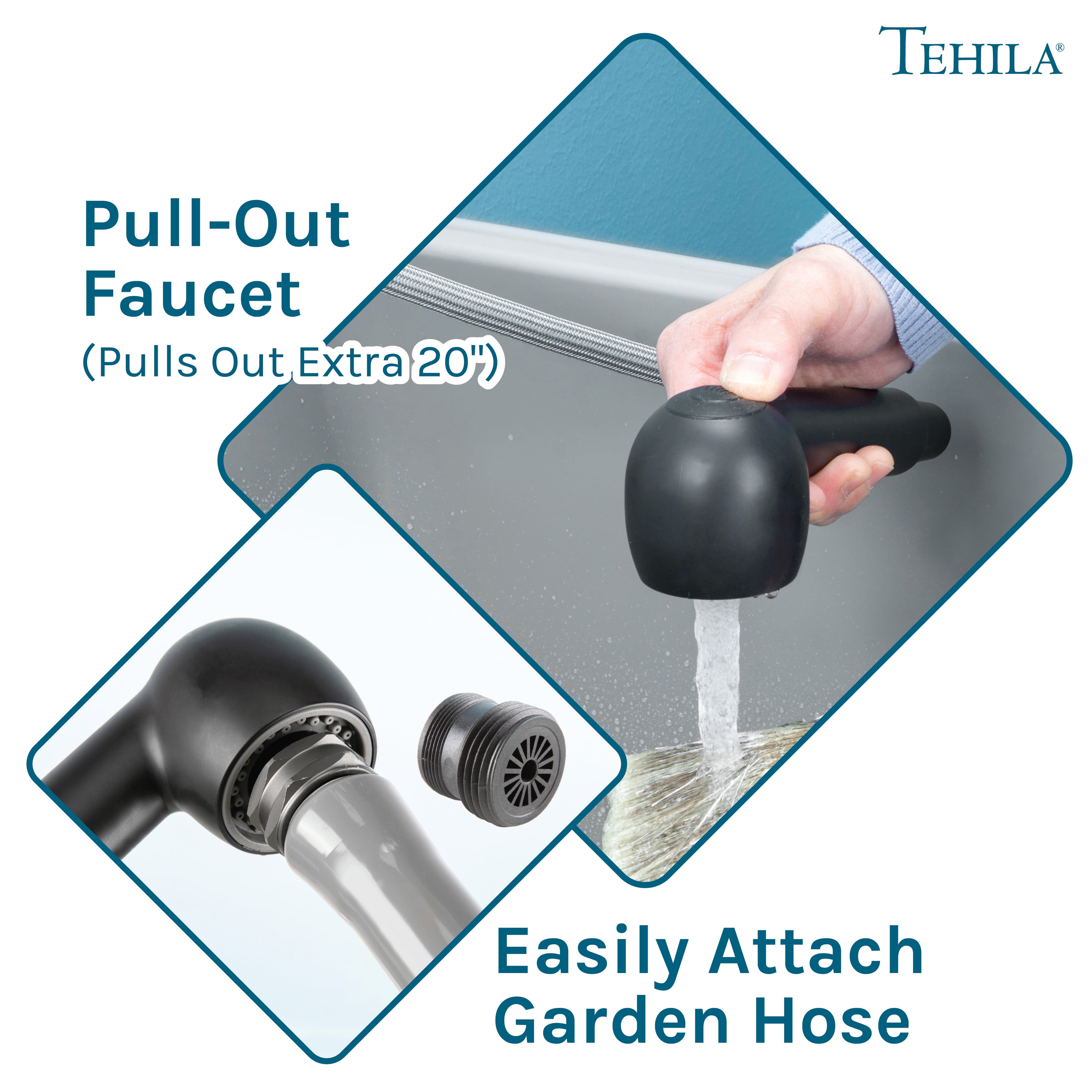16-gallon sink capacity Sprayer pulls-out an extra 14 inches, dual lever handles Rubber drain plug included Pre-formed installation holes can easily be knocked through with the quick use of a screwdriver and hammer Metal legs with plastic foot levellers balance out the sink’s weight on uneven floors Faucet dimensions: 9 in. H x 9 in. D Assembled dimensions: 17.75 in. W x 23.25 in. D x 43 in. H