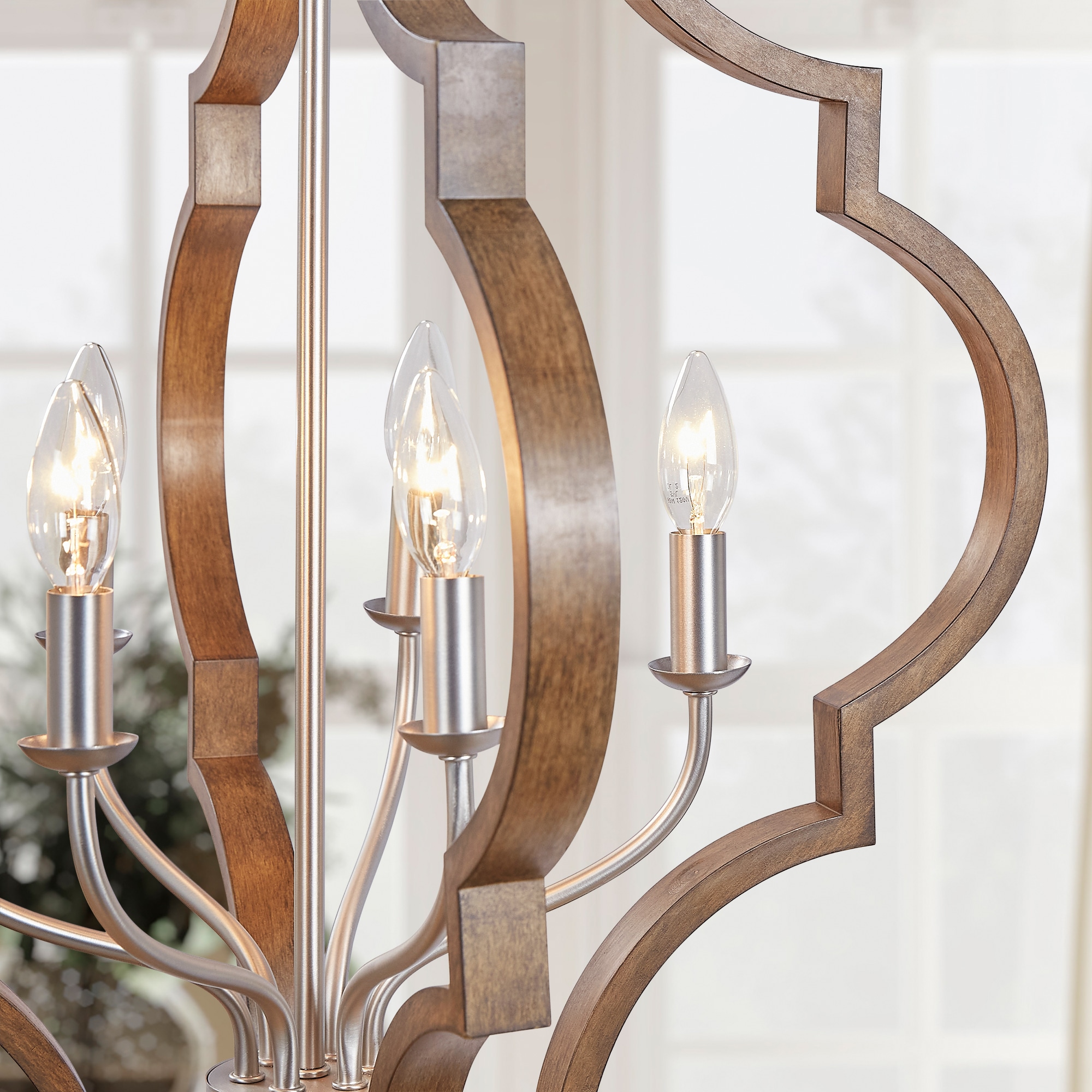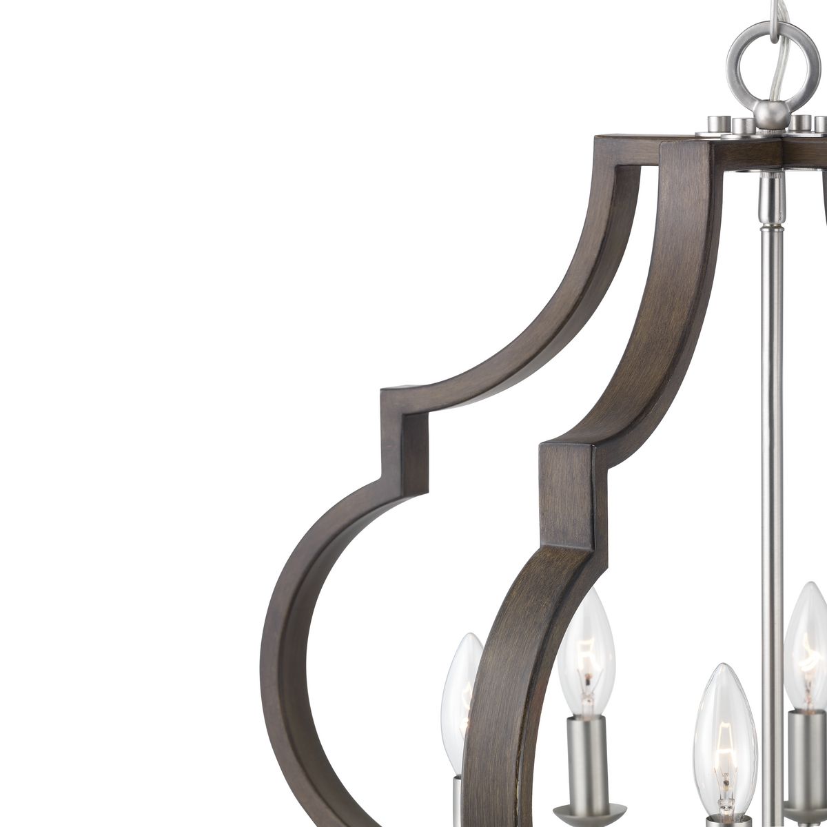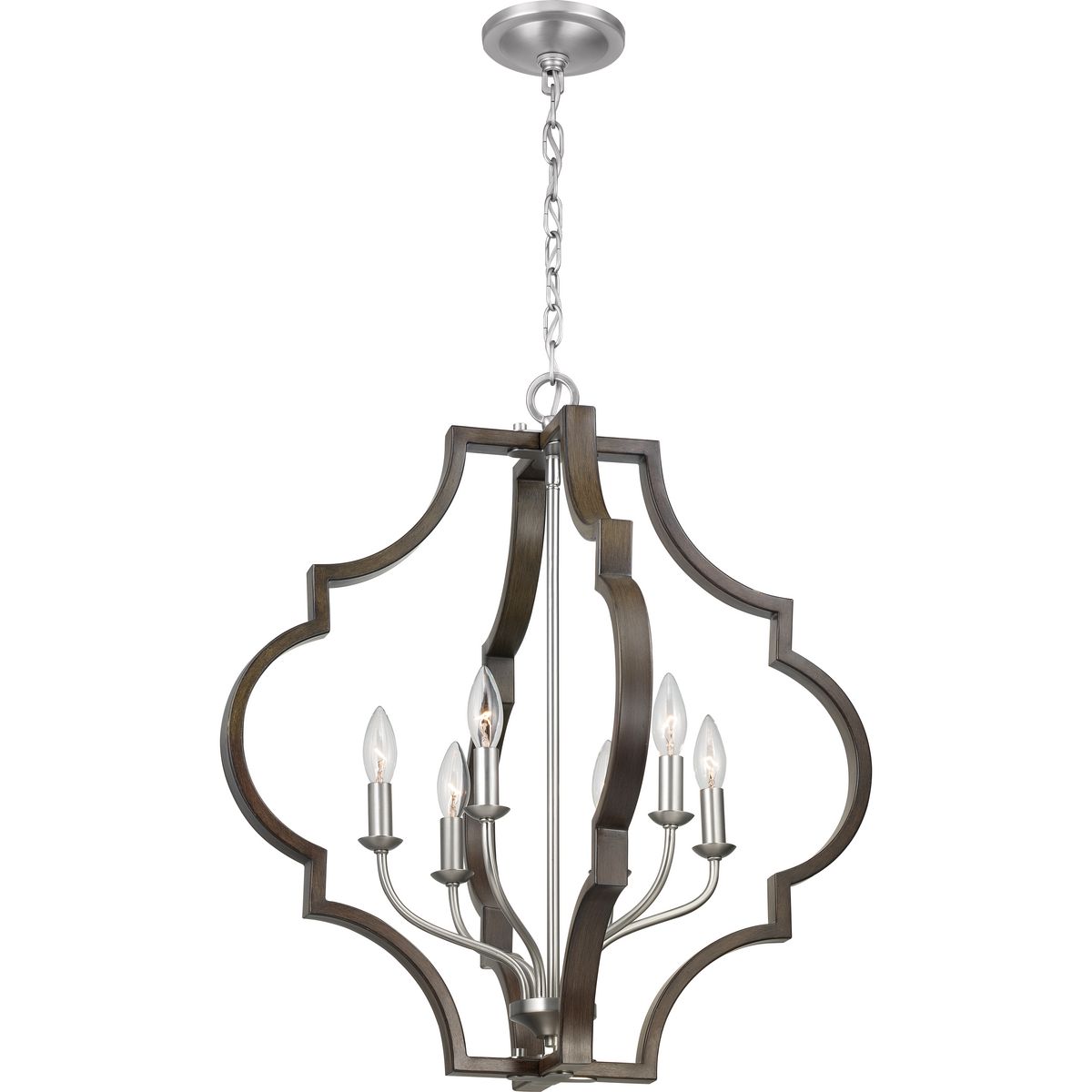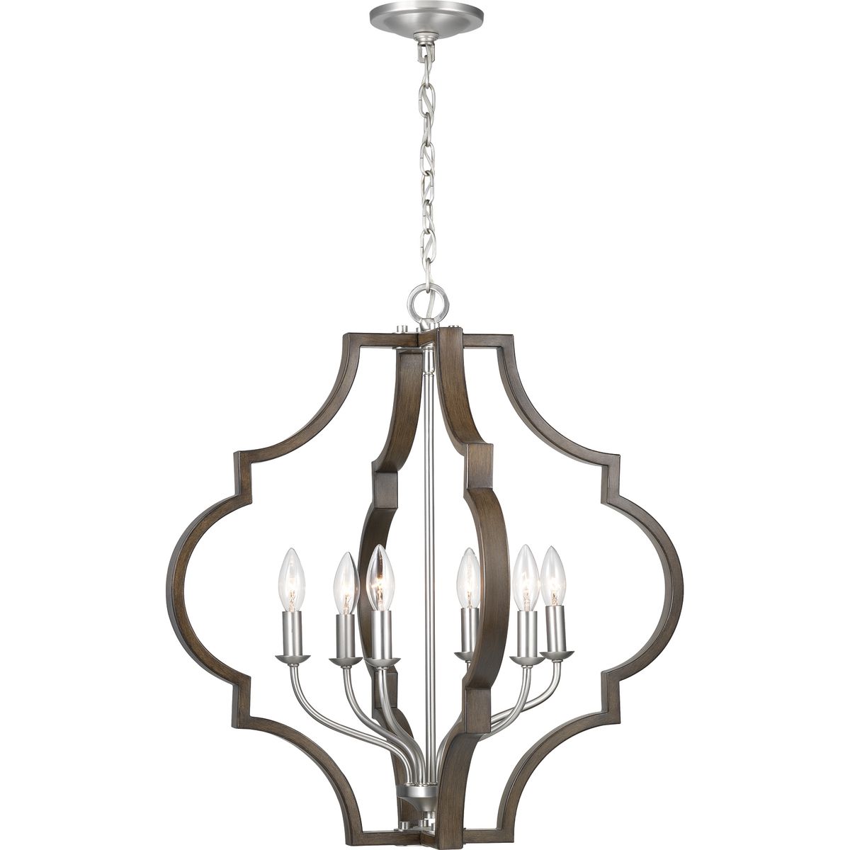 A classic quatrefoil frame is updated with a mixed metal finish adding on-trend style to the six-light pendant from the Teigen collection. Satin nickel is paired with teak wood for a beautiful, two-toned finish. Six-light candelabra blends traditional styling with transitional flair.