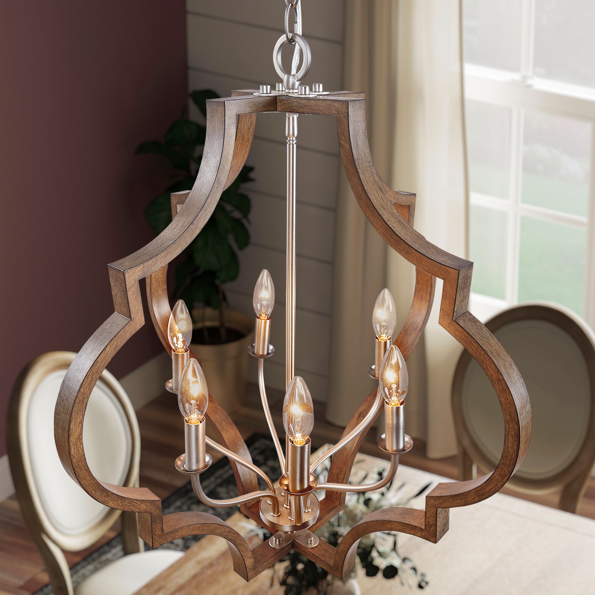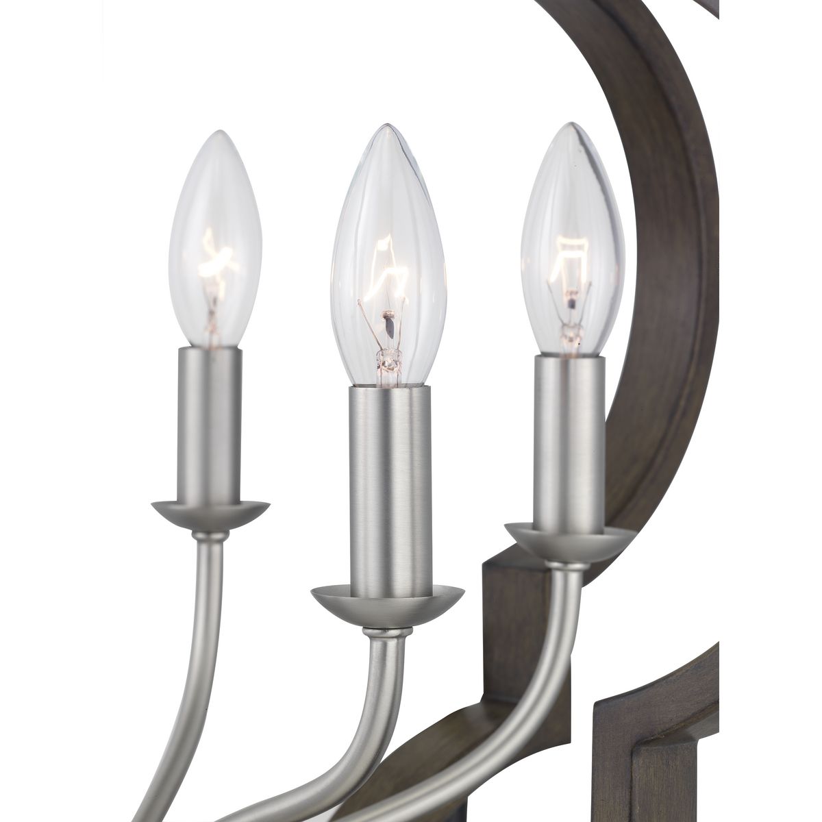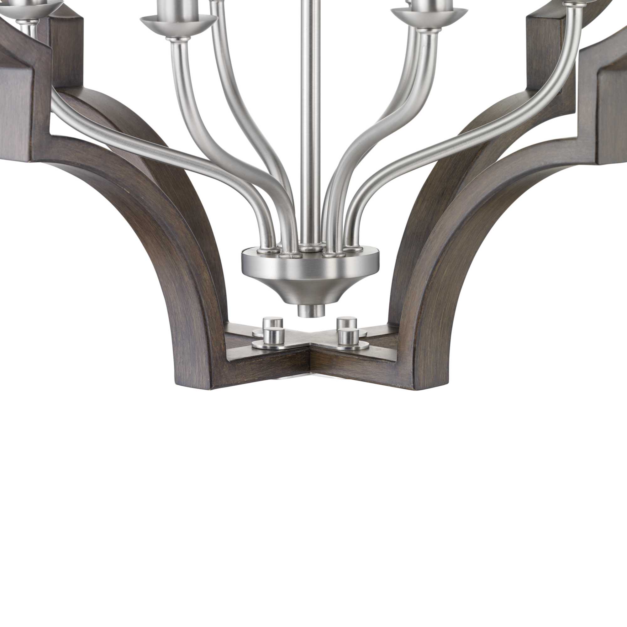 A classic quatrefoil frame is updated with a mixed metal finish adding on-trend style to the six-light pendant from the Teigen collection. Satin nickel is paired with teak wood for a beautiful, two-toned finish. Six-light candelabra blends traditional styling with transitional flair.