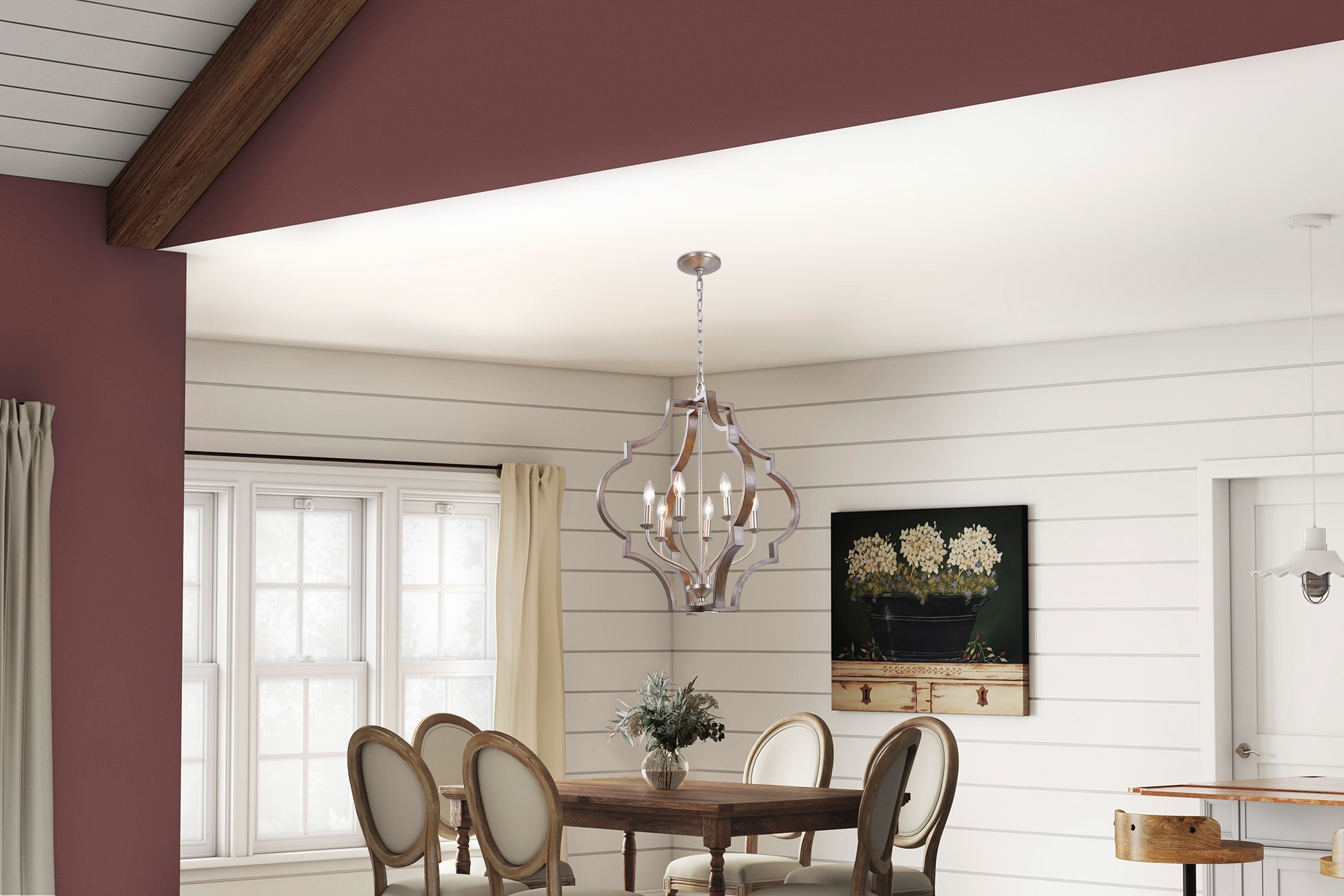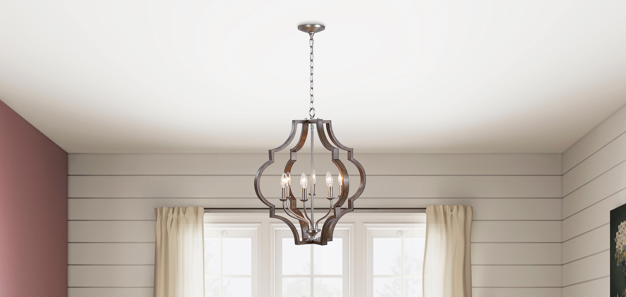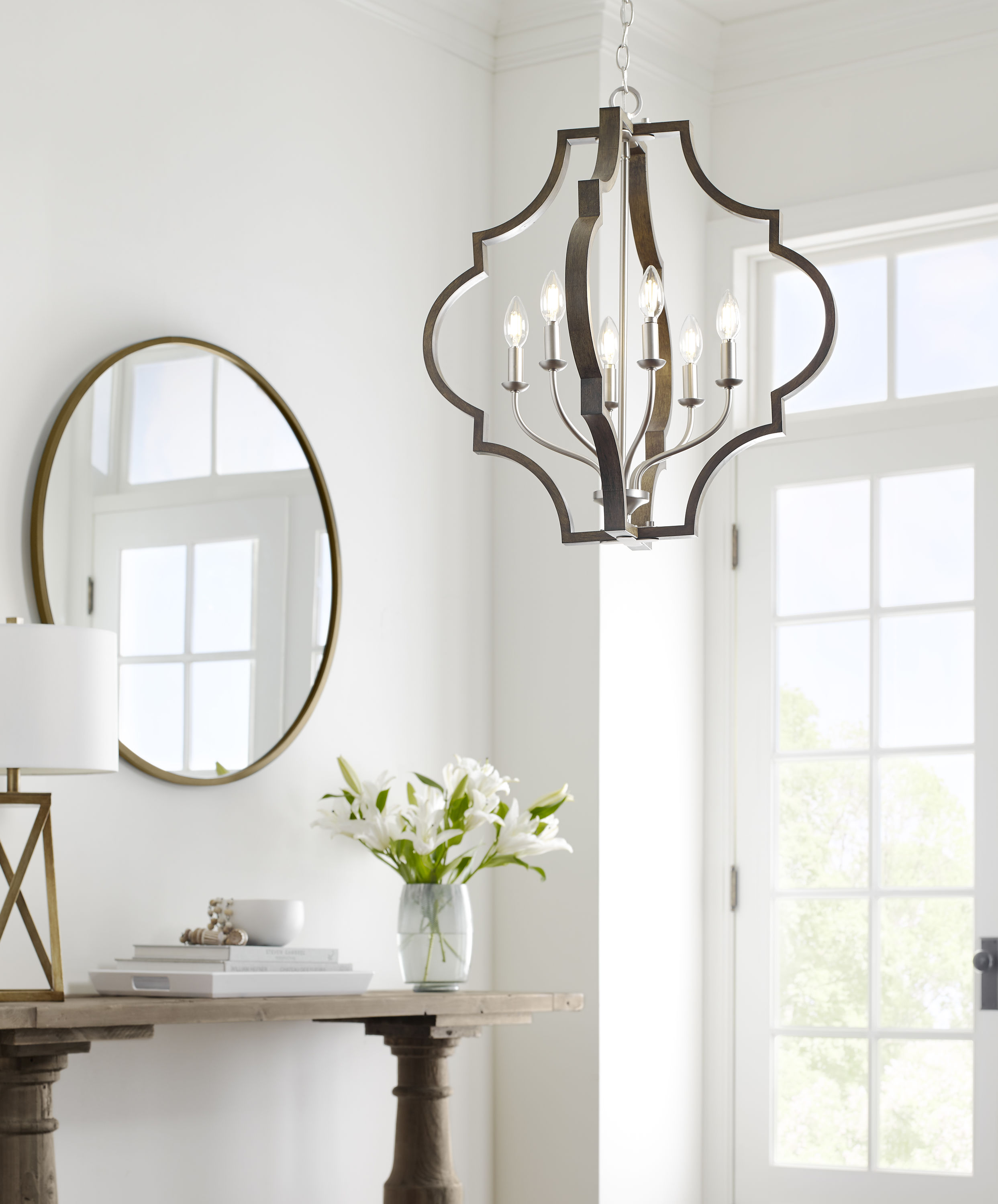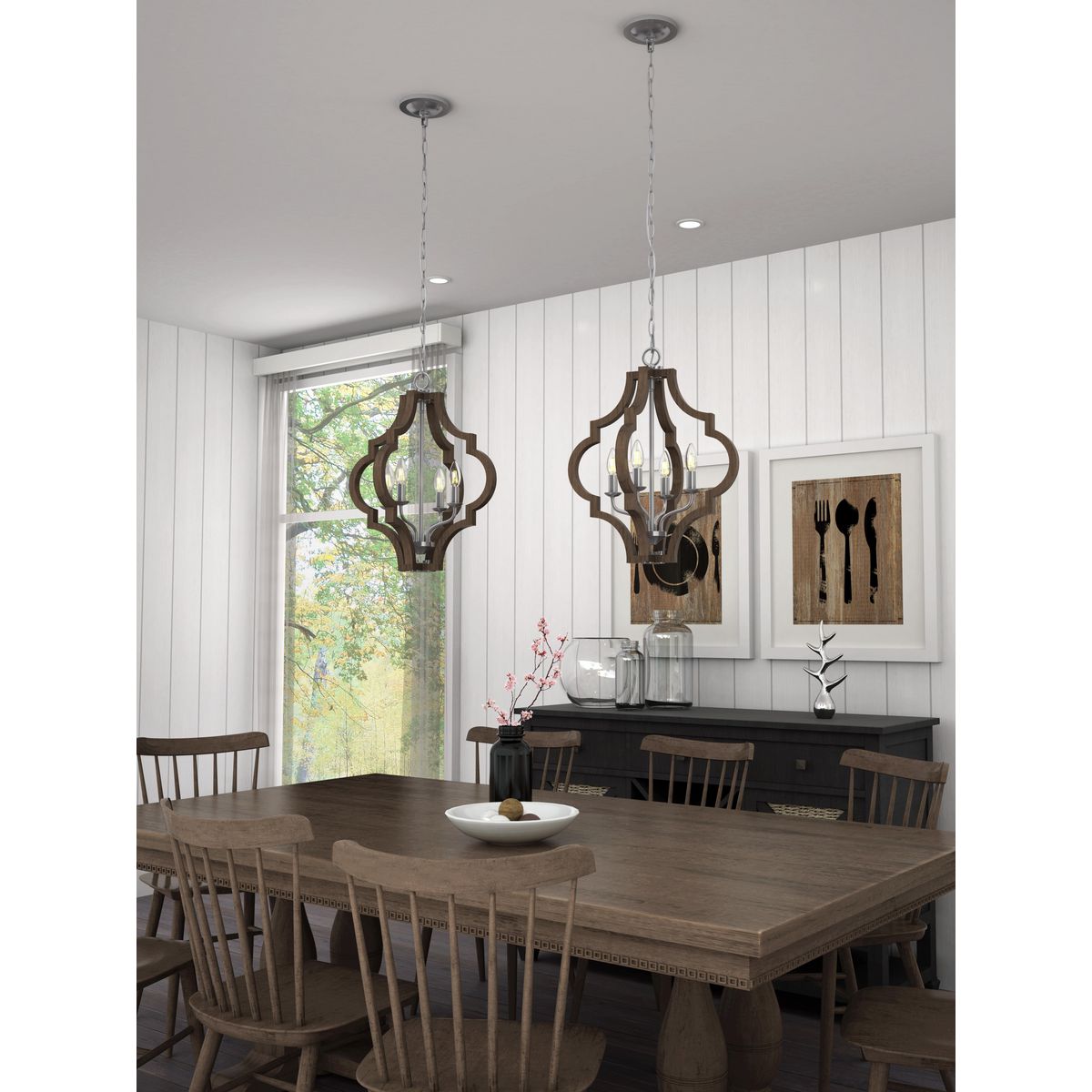A classic quatrefoil frame is updated with a mixed metal finish adding on-trend style to the six-light pendant from the Teigen collection. Satin nickel is paired with teak wood for a beautiful, two-toned finish. Six-light candelabra blends traditional styling with transitional flair.
