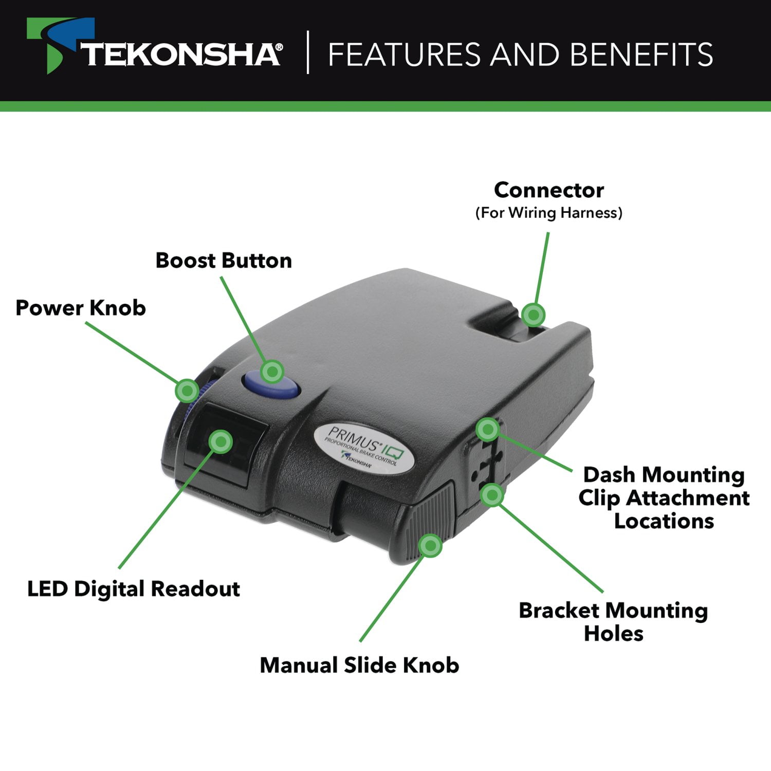 The Tekonsha Primus IQ electric trailer brake controller gives you dependable braking power in a compact design. As an industry staple for more than ten years, this proportional braking system provides a smooth braking response in any stopping situation. With its petite yet durable exterior, this trailer brake controller fits nicely under the dash, making it easily accessible from the driver?s seat without being in the way. While also compact, the brains of the Primus IQ are astute. This insightful brake controller has an easy-to-read LED display, self-diagnostic check to monitor your connection and trailer braking activity and is self-leveling when mounted within a 90-degree vertical range, so there?s no need to adjust the unit once it?s installed. It also features a power output knob to set your desired braking power, a boost option that lets you apply up quickly and easily to three levels of additional trailer braking power, especially when hauling heavier loads, and manual override. The Primus IQ was created to work with electric braking systems, works proportionally in reverse to make backing into tough spots a bit easier, and – like the Prodigy P3, Prodigy P2, and many other Tekonsha brake controllers ? utilizes primary sensor technology to ensure the smoothest stop possible. When you?re done towing, the IQ?s snap-in dash mounting clip, Plug & Play port for two plug adapters, and removeable electrical connector allow the unit to be quickly stored. The Primus IQ is truly a complete trailer brake controller kit. It works with trailers with 1-3 axles, comes with all necessary mounting hardware, and is backed by a limited lifetime warranty. PROPORTIONAL ELECTRIC BRAKE CONTROLLER: Provides automatic braking based on the intensity and rate at which you apply your tow vehicle?s brakes, giving you smooth braking thanks to an internal inertia sensor. This makes the Primus IQ brake controller ideal for general and heavy-duty emergency braking. EASILY INSTALL AND STOW, THANKS TO PLUG & PLAY: The Primus IQ trailer brake controller has a snap-in dash mounting clip, Plug & Play port for two plug adapters, and removeable electrical connector so the unit can be easily unplugged, unclipped, and stored. EASY-TO-READ LED DISPLAY: Digital LED display shows settings, real-time diagnostics, and alerts. BOOST FEATURE PROVIDES EXTRA BRAKING POWER: Boost provides up to three levels of additional stopping power at the touch of a button, giving you confidence in stopping safely when you?re hauling heavier loads and/or need more power to stop. VERSATILE: The Primus IQ electric brake controller is compatible with a wide range of vehicles including Ford, GM, Chevy, Dodge, RAM, Toyota, Jeep, and more with 2, 4, or 6 brakes (1-3 axles). Vehicle-specific Tekonsha Plug & Play brake controller wiring harness sold separately.
