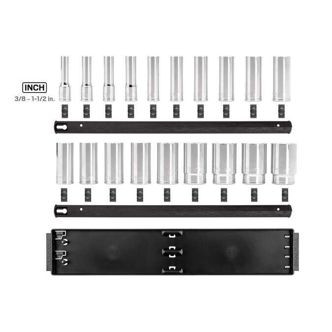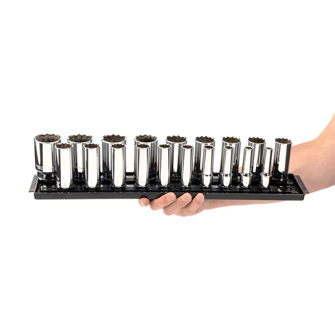 - 19-pc 1/2 in drive deep 12-point inch sockets: 3/8, 7/16, 1/2, 9/16, 5/8, 11/16, 3/4, 13/16, 7/8, 15/16, 1, 1-1/16, 1-1/8, 1-3/16, 1-1/4, 1-5/16, 1-3/8, 1-7/16, 1-1/2 in
