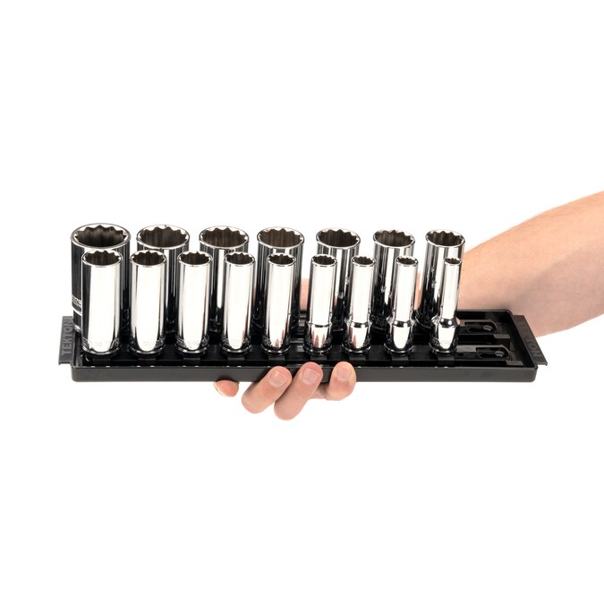 - 16-pc 1/2 in drive deep 12-point inch sockets: 3/8, 7/16, 1/2, 9/16, 5/8, 11/16, 3/4, 13/16, 7/8, 15/16, 1, 1-1/16, 1-1/8, 1-3/16, 1-1/4, 1-5/16 in