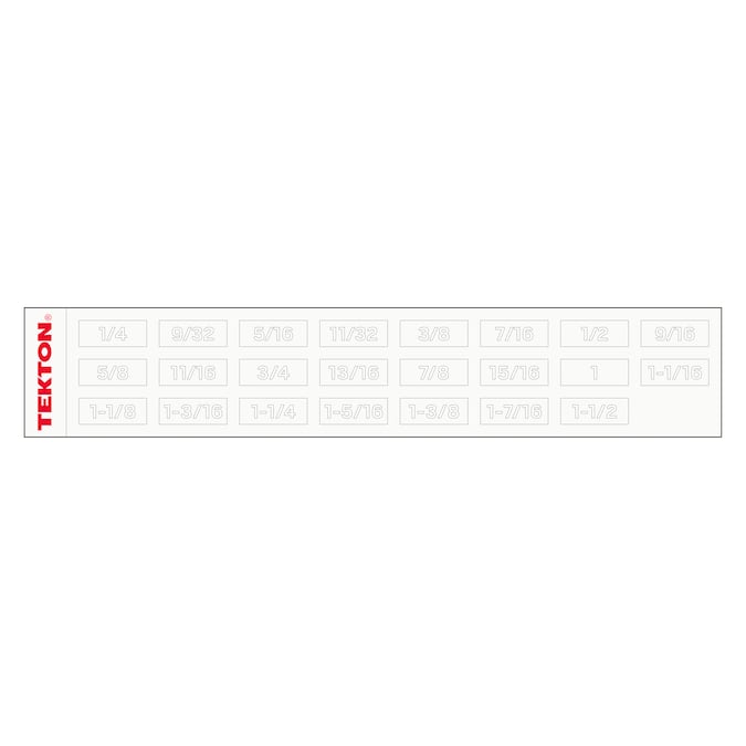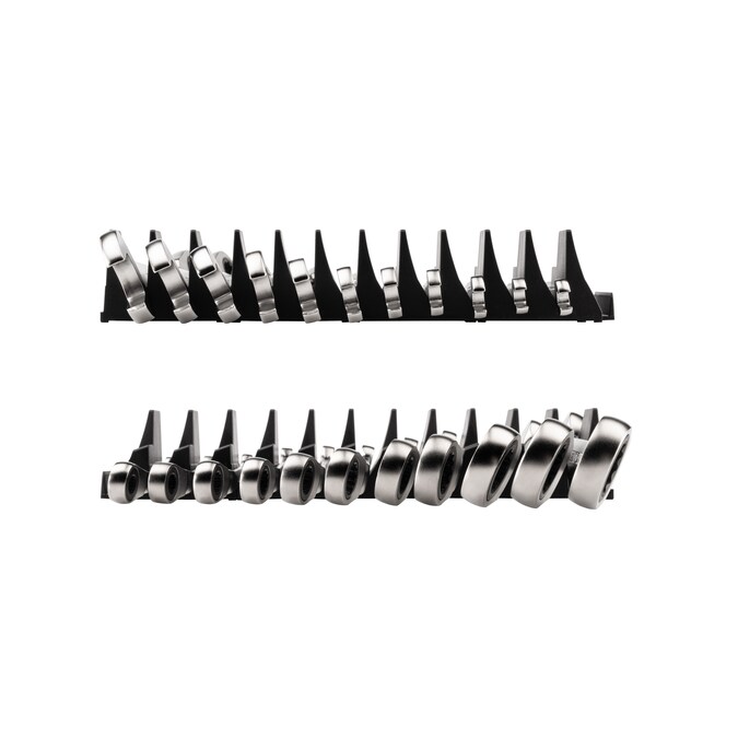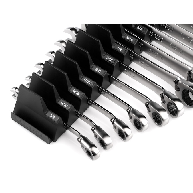 Each Tekton reversible ratcheting combination wrench is permanently marked with both a high-visibility laser marking and a stamped marking for easy size identification. The 12-point box end fits multiple types of fasteners including 6-point, 12-point, and square. The 15-degree offset box end wrench geometry creates clearance for your fingers and makes it easier to reach around obstructions. The drive switch allows you to quickly switch ratcheting directions while you’re working. The wrench is abrasive-blasted to create a finely textured finish and then plated with a trivalent chrome process, ensuring that the finish won’t flake off or corrode over time. The set includes a modular wrench organizer that fits most toolbox drawers, keeping your ratcheting wrenches neatly arranged with consistent spacing.