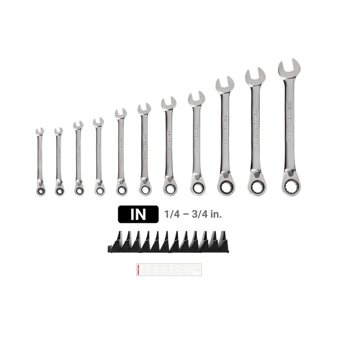 - 11-pc reversible ratcheting combination wrenches: 1/4, 9/32, 5/16, 11/32, 3/8, 7/16, 1/2, 9/16, 5/8, 11/16, 3/4 in
