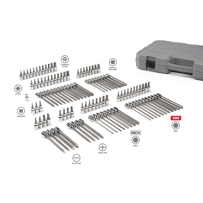 TEKTON heat-treated S2 steel bits are press-fit into the socket for a straight, tightly mated fit that can’t loosen over time or under stress. The tips are machined to exact tolerances for precise engagement with fasteners. Large, stamped size markings are permanently impressed into the material by a roll-stamp die. Detent grooves and beveled edges provide a smooth and secure connection with the drive tool. Sturdy, clearly marked storage case is made from high-density polyethylene material that withstands exposure to common lubricants, fuels, and solvents.