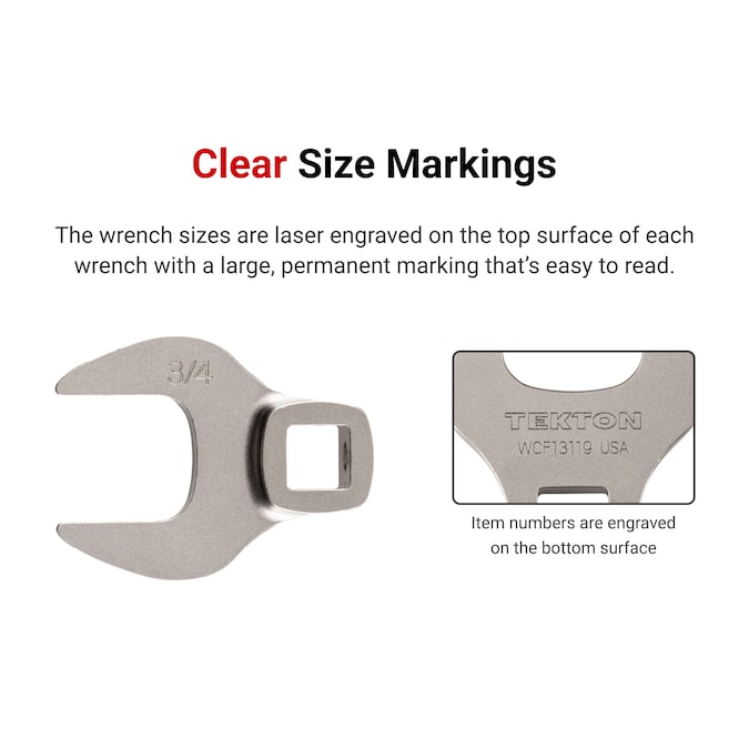 - Clear Markings – The wrench sizes are laser engraved on the top surface of each tool with a large, permanent marking that’s easy to read