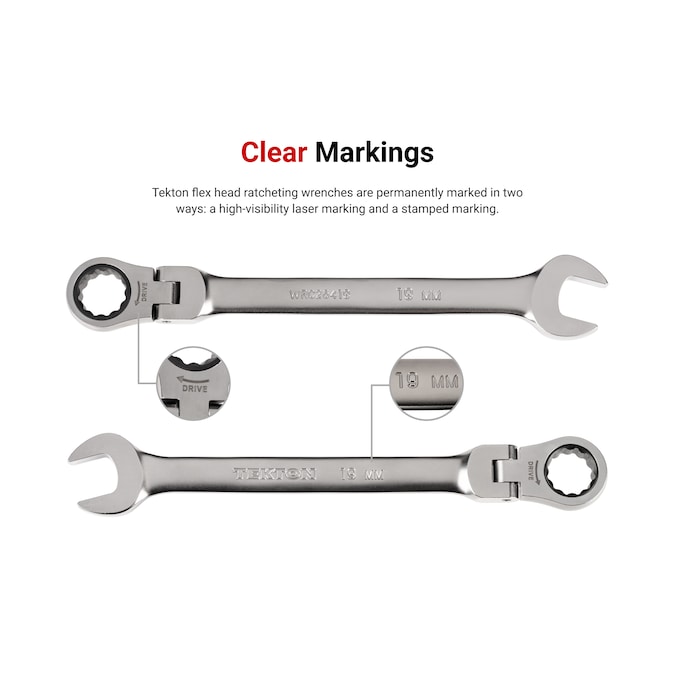 • Clear, Stamped Markings – A size marking is permanently stamped onto both sides of each ratcheting wrench for quick identification
