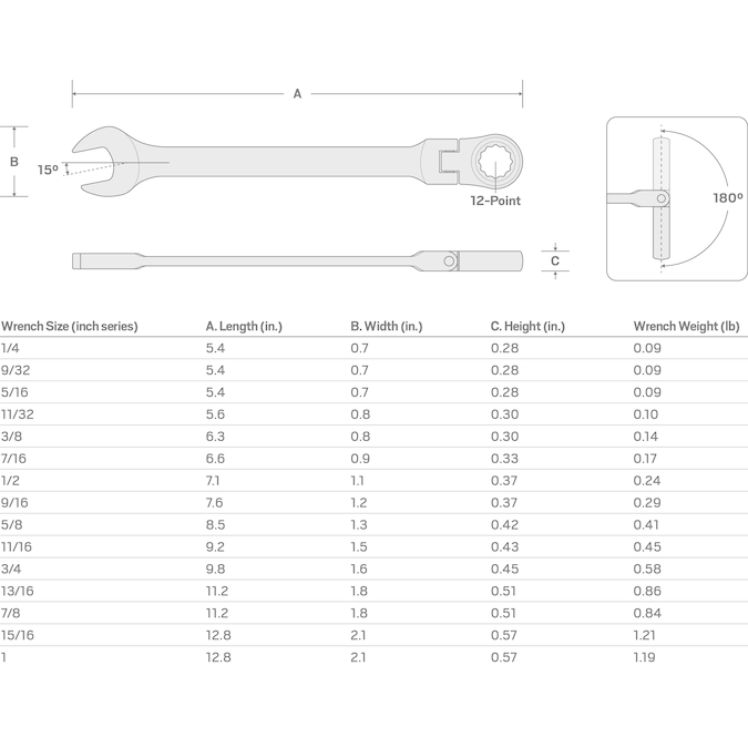 - 15-pc flex head ratcheting combination wrenches: 1/4, 9/32, 5/16, 11/32, 3/8, 7/16, 1/2, 9/16, 5/8, 11/16, 3/4, 13/16, 7/8, 15/16, 1 in