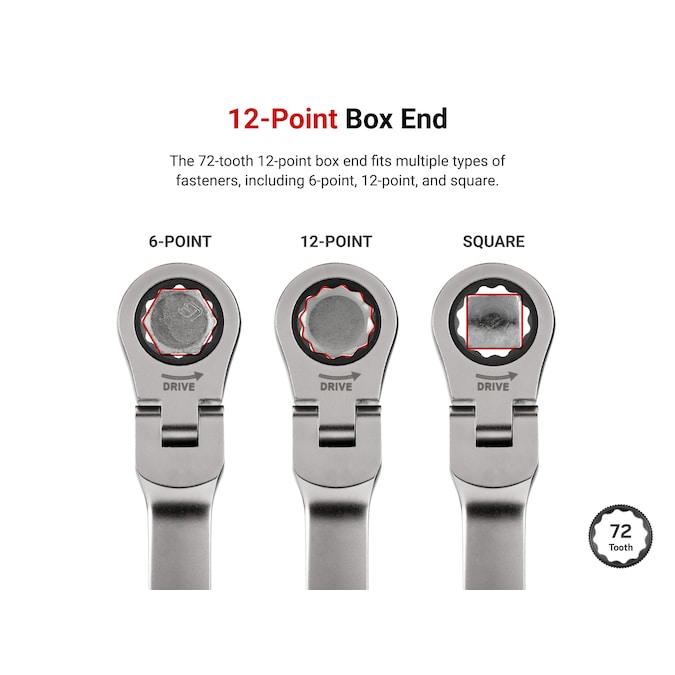 - 12-point Box End – The box end fits multiple types of fasteners, including 6-point, 12-point, and square