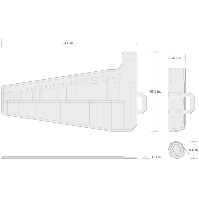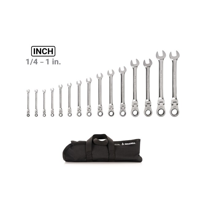 - 15-pc flex head ratcheting combination wrenches: 1/4, 9/32, 5/16, 11/32, 3/8, 7/16, 1/2, 9/16, 5/8, 11/16, 3/4, 13/16, 7/8, 15/16, 1 in