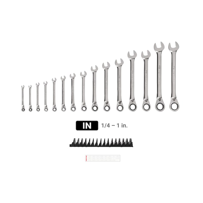 • 15-pc reversible ratcheting combination wrenches: 1/4, 9/32, 5/16, 11/32, 3/8, 7/16, 1/2, 9/16, 5/8, 11/16, 3/4, 13/16, 7/8, 15/16, 1 in