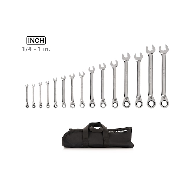 - 15-pc reversible ratcheting combination wrenches: 1/4, 9/32, 5/16, 11/32, 3/8, 7/16, 1/2, 9/16, 5/8, 11/16, 3/4, 13/16, 7/8, 15/16, 1 in