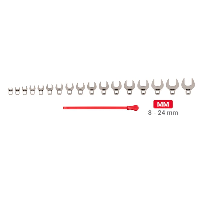 - 17-pc 3/8 in drive crowfoot wrenches: 8, 9, 10, 11, 12, 13, 14, 15, 16, 17, 18, 19, 20, 21, 22, 23, 24 mm