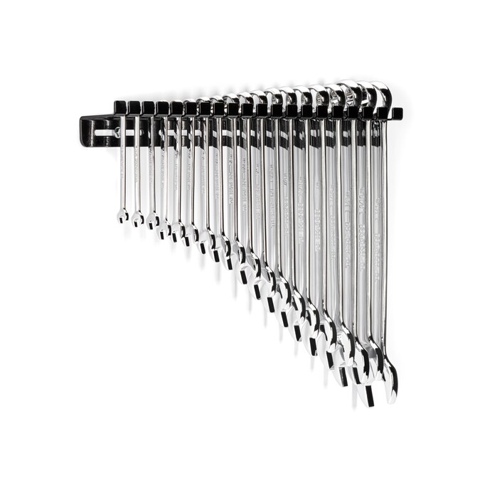 This TEKTON 19-Piece Combination Wrench Set contains a complete size range from 1/4 inch to 1-1/4 inch for a wide variety of applications. To reduce the working swing arc in tight spaces, the open ends of the wrenches are angled 15 degrees so they can be flipped over with each rotation to engage the fastener twice as often. The 12-point box ends offer even more access angles, and they’re offset 15 degrees to create clearance for your fingers to reach around obstructions. The included powder-coated, 12-gauge steel wall hanger keeps the set neatly organized and quickly accessible.