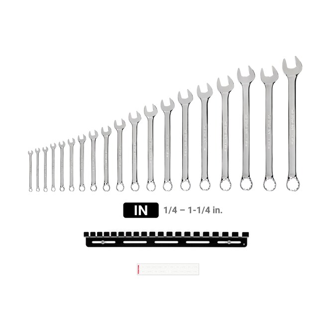 - 19-pc inch combination wrenches: 1/4, 9/32, 5/16, 11/32, 3/8, 7/16, 1/2, 9/16, 5/8, 11/16, 3/4, 13/16, 7/8, 15/16, 1, 1-1/16, 1-1/8, 1-3/16, 1-1/4 in