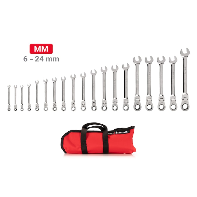 - 19-pc flex head ratcheting combination wrenches: 6, 7, 8, 9, 10, 11, 12, 13, 14, 15, 16, 17, 18, 19, 20, 21, 22, 23, 24 mm