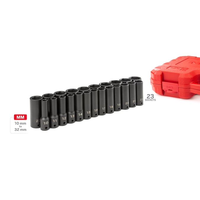 - 23-pc 1/2 inch drive deep 6-point impact sockets: 10, 11, 12, 13, 14, 15, 16, 17, 18, 19, 20, 21, 22, 23, 24, 25, 26, 27, 28, 29, 30, 31, 32 mm