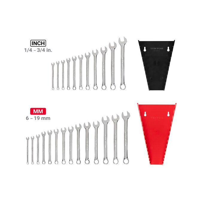 A complete series of every size from 6mm to 19mm and 1/4 inch to 3/4 inch, the TEKTON 25-pc. Combination Wrench Set is compactly organized in wrench organizer racks. Open ends are angled 15° and box ends are designed to grip flat sides of fastener heads, not corners, to prevent round-off.