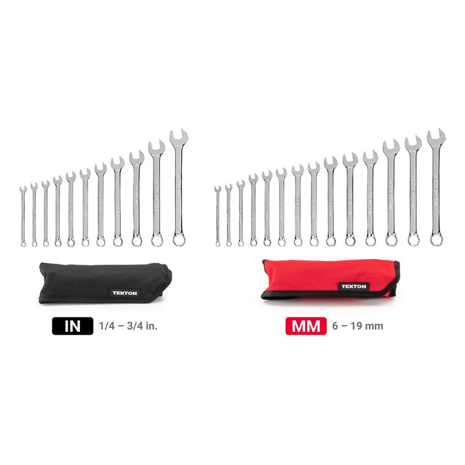 A complete series of every size from 1/4 inch to 1 inch and 6 mm to 19 mm, the TEKTON 34-pc. Combination Wrench Set is compactly organized in a compact roll-up pouch that keeps wrenches well-packed and unable to slide out. Open ends are angled 15° and box ends are designed to grip flat sides of fastener heads, not corners, to prevent round-off.
