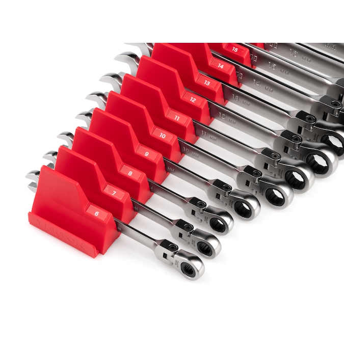 Each Tekton ratcheting flex head wrench is permanently marked with both a high-visibility laser marking and a stamped marking for easy size identification. The 12-point box end fits multiple types of fasteners including 6-point, 12-point, and square. The flex head sweeps smoothly through 180-degrees without any set positions. This allows the wrench to operate at any angle and navigate around obstructions in its swing path. The wrench is abrasive-blasted to create a finely textured finish and then plated with a trivalent chrome process, ensuring that the finish won’t flake off or corrode over time. The set includes a modular wrench organizer that fits most toolbox drawers, keeping your ratcheting wrenches neatly arranged with consistent spacing.