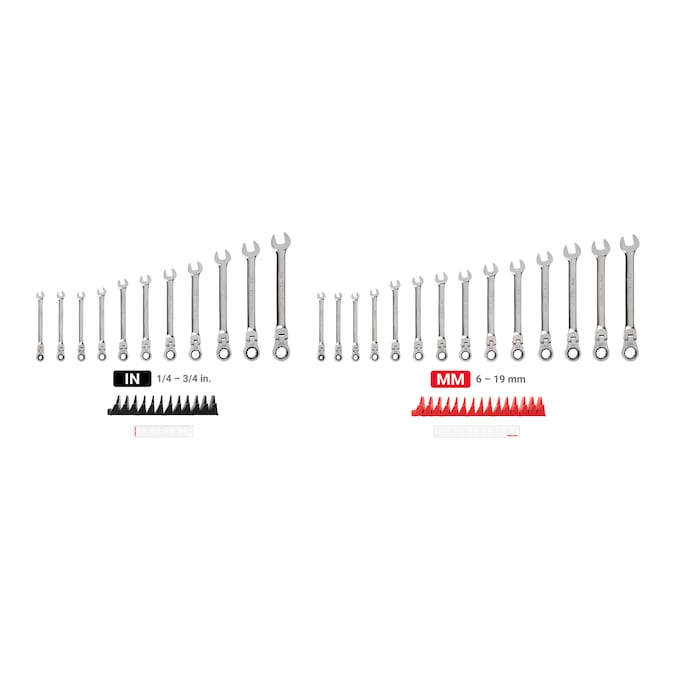 - 14-pc metric flex head ratcheting combination wrenches: 1/6, 7, 8, 9, 10, 11, 12, 13, 14, 15, 16, 17, 18, 19 mm
