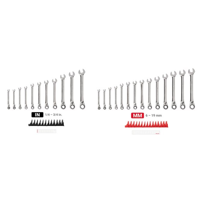 • 11-pc inch reversible ratcheting combination wrenches: 1/4, 9/32, 5/16, 11/32, 3/8, 7/16, 1/2, 9/16, 5/8, 11/16, 3/4 in
