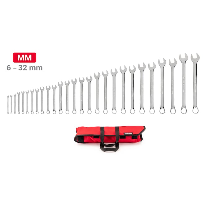 A complete series of every size from 6 mm to 32 mm., the TEKTON 27-pc Combination Wrench Set is compactly organized in a roll-up pouch that keeps wrenches well-packed and unable to slide out. Open ends are angled 15° and box ends are designed to grip flat sides of fastener heads, not corners, to prevent round-off.