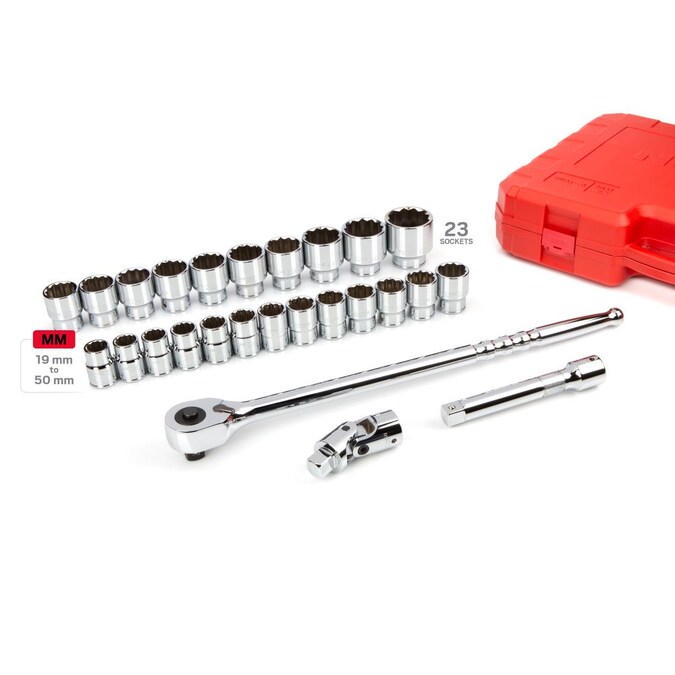 - Includes (23) 3/4 inch drive 12-point metric sockets: 19, 20, 21, 22, 23, 24, 25, 26, 27, 28, 29, 30, 31, 32, 33, 34, 35, 36, 37, 38, 41, 46, 50 mm