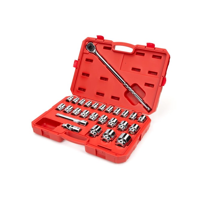 The TEKTON 3/4 Inch Drive 12-Point Socket and Ratchet Set includes a range of socket sizes from 19 to 50 mm. The set comes equipped with a 72-Tooth quick-release ratchet as well as a universal joint and 8-inch extension, which aren’t often found in most sets. All of the tools come stored in a sturdy carrying case. The 12-point socket openings are an exact fit for double hex fasteners and also work with hex and square shapes. The large, die-stamped markings are permanently impressed into the material and optimized for readability. A mirror chrome-plated finish protects against corrosion and easily wipes clean. The TEKTON 3/4 in. drive socket system is well-suited for big service and repair jobs on heavy equipment, trucks, tractors, and large machinery and consistently meets or exceeds the industry standards for socket strength and performance.