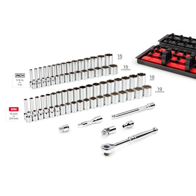 - 19-pc 3/8 in drive standard and deep 12-point metric sockets: 6, 7, 8, 9, 10, 11, 12, 13, 14, 15, 16, 17, 18, 19, 20, 21, 22, 23, 24 mm