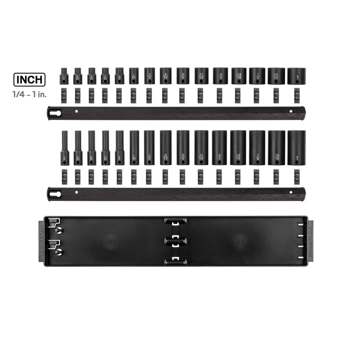 - 15-pc 3/8 inch drive standard 12-point inch impact sockets: 1/4, 9/32, 5/16, 11/32, 3/8, 7/16, 1/2, 9/16, 5/8, 11/16, 3/4, 13/16, 7/8, 15/16, 1 in