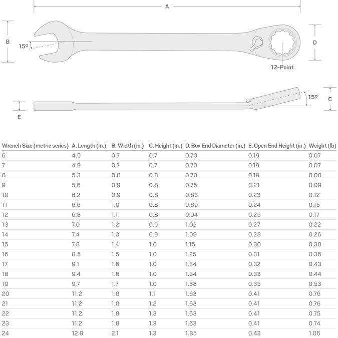• 19-pc metric reversible ratcheting combination wrenches: 6, 7, 8, 9, 10, 11, 12, 13, 14, 15, 16, 17, 18, 19, 20, 21, 22, 23, 24 mm